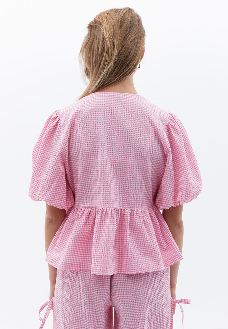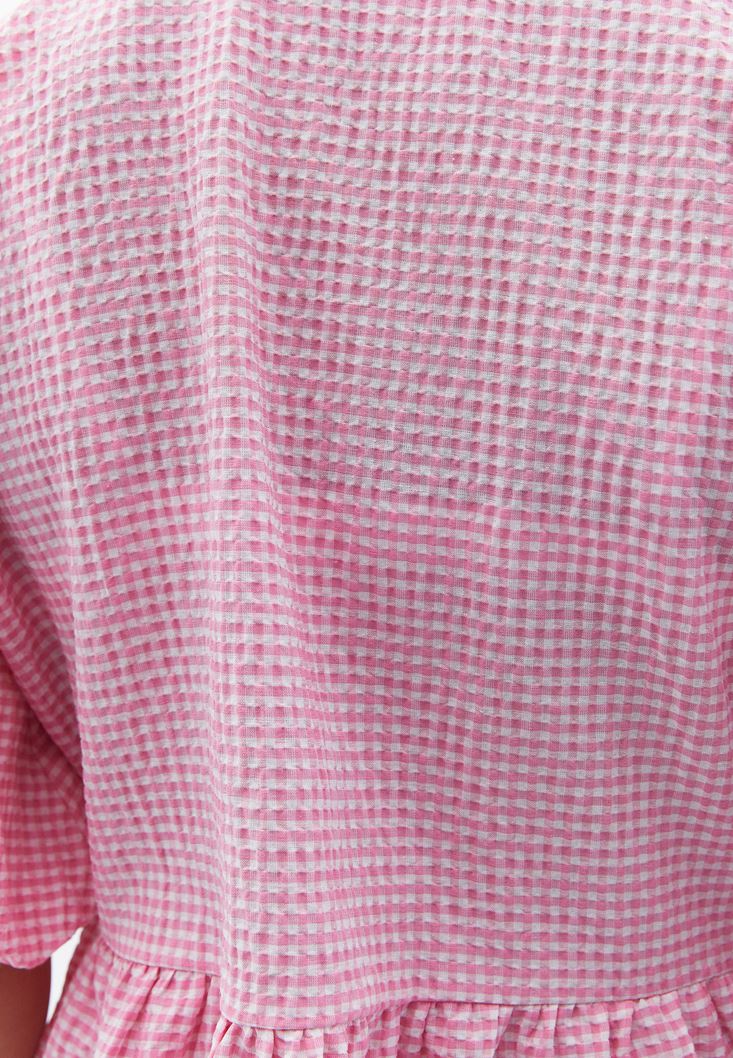 Pamuk karışımlı doku, pötikare desenli, sıfır yaka, bedenden uzak loose fit, balon kollu, ön kısmı bağcık detaylı, belden itibaren volanlı tasarım.