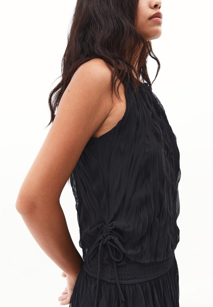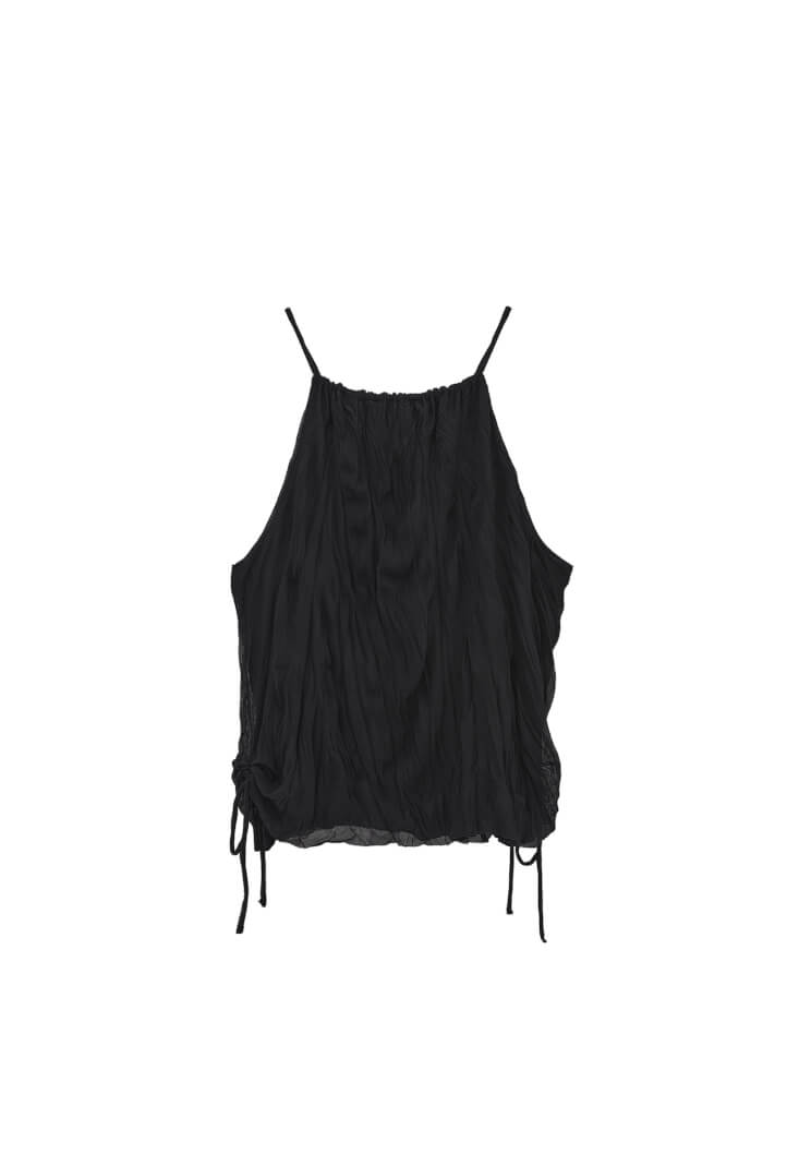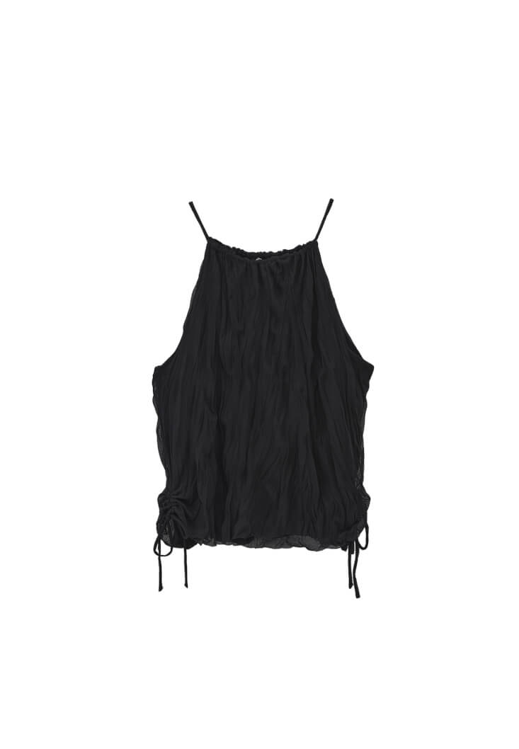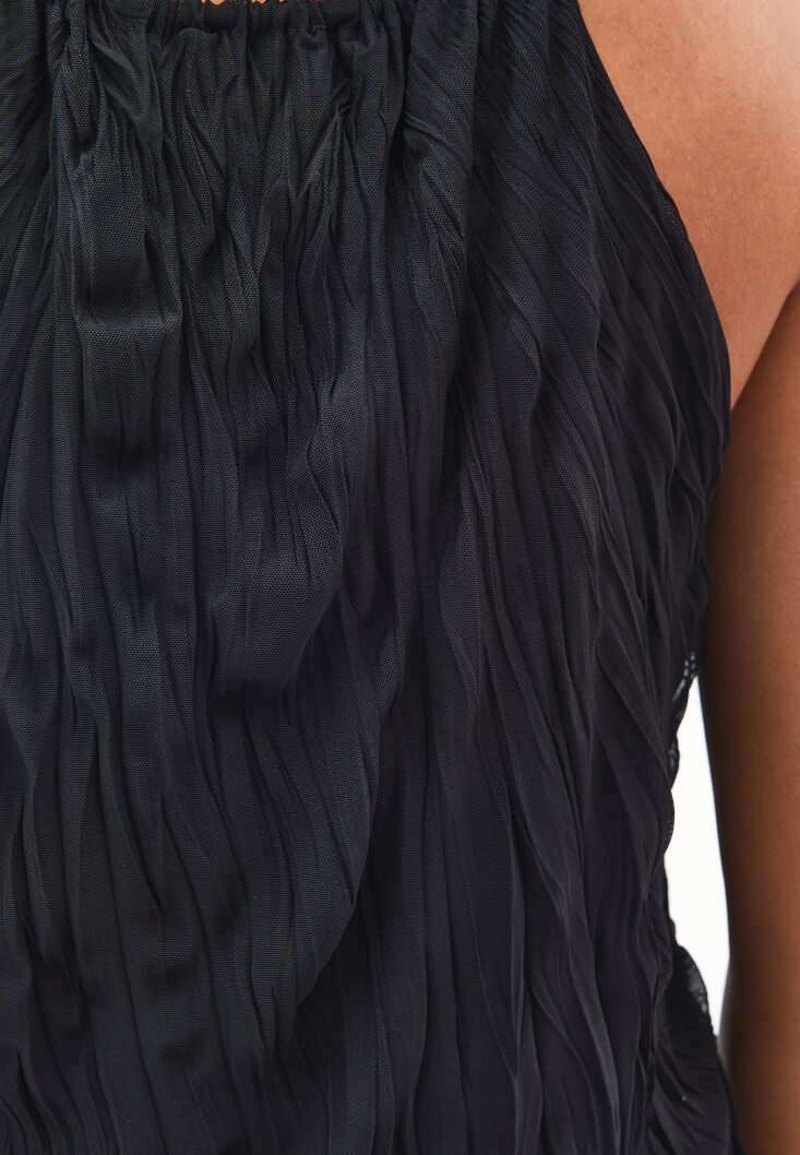 Bedenden uzak loose fit, halter yaka, piliseli doku, yan kısımları bağlama detaylı, ince askılı.