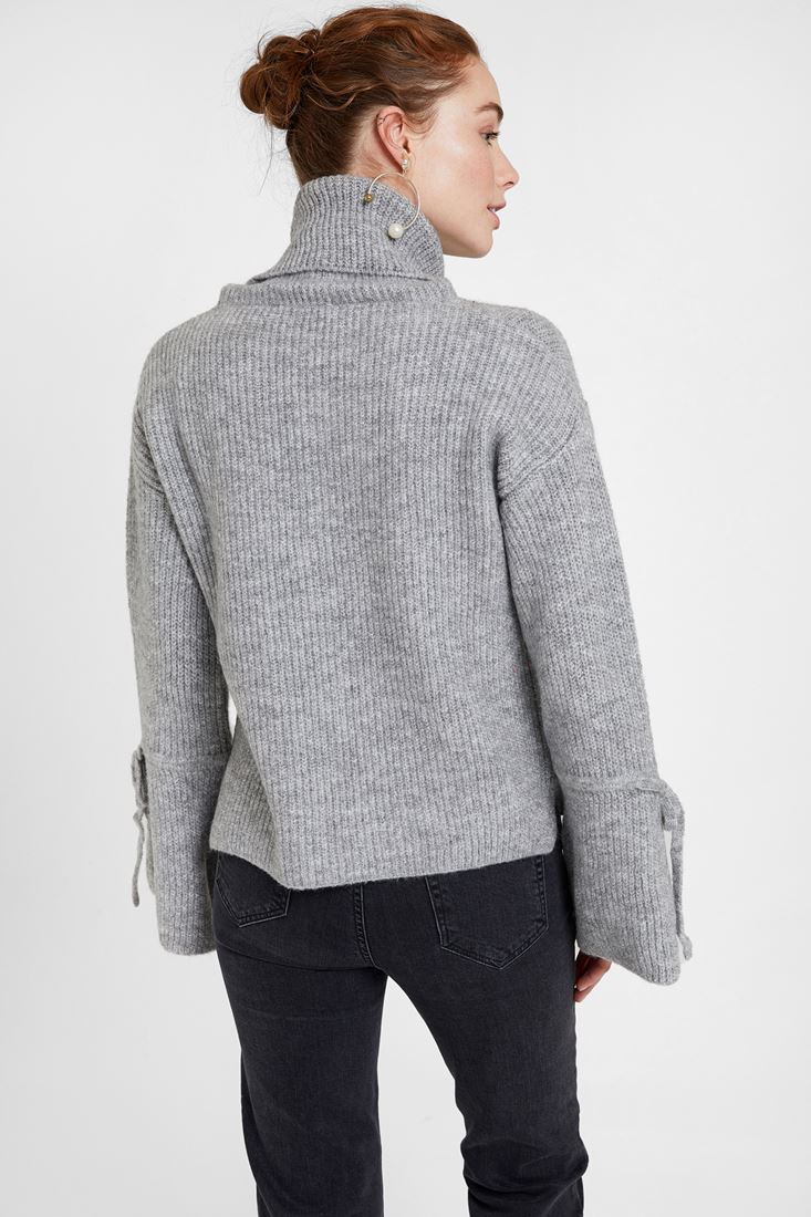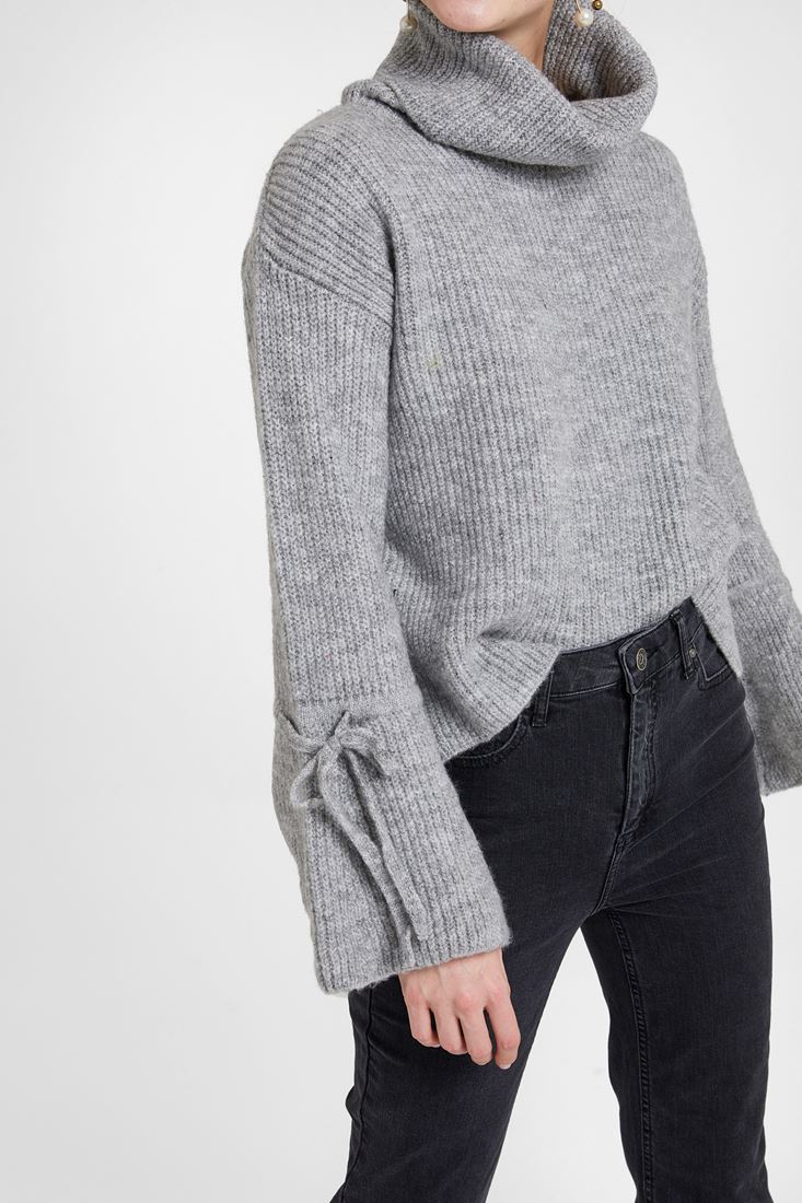 • Bayan Gri Bağlama Detaylı Boğazlı Kazak