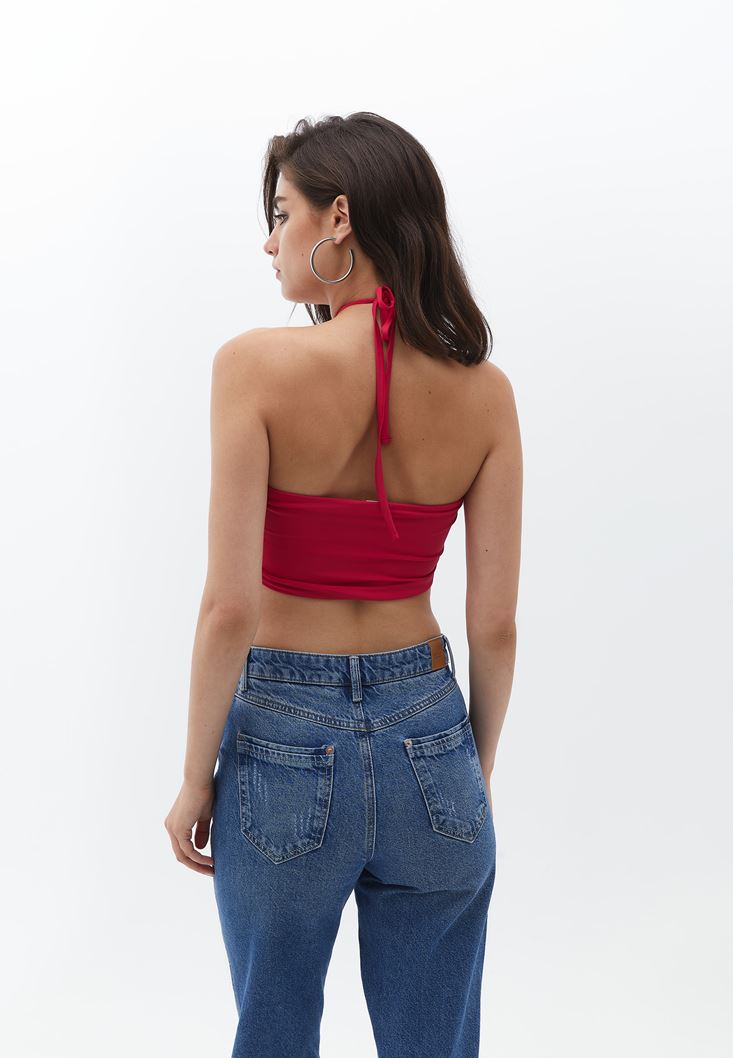 Bedeni saran özel esnek doku, ince askılı, ön kısmı fırfır detaylı, straplez yaka, crop kesim, farklı şekillerde bağlanabilen özel tasarım.