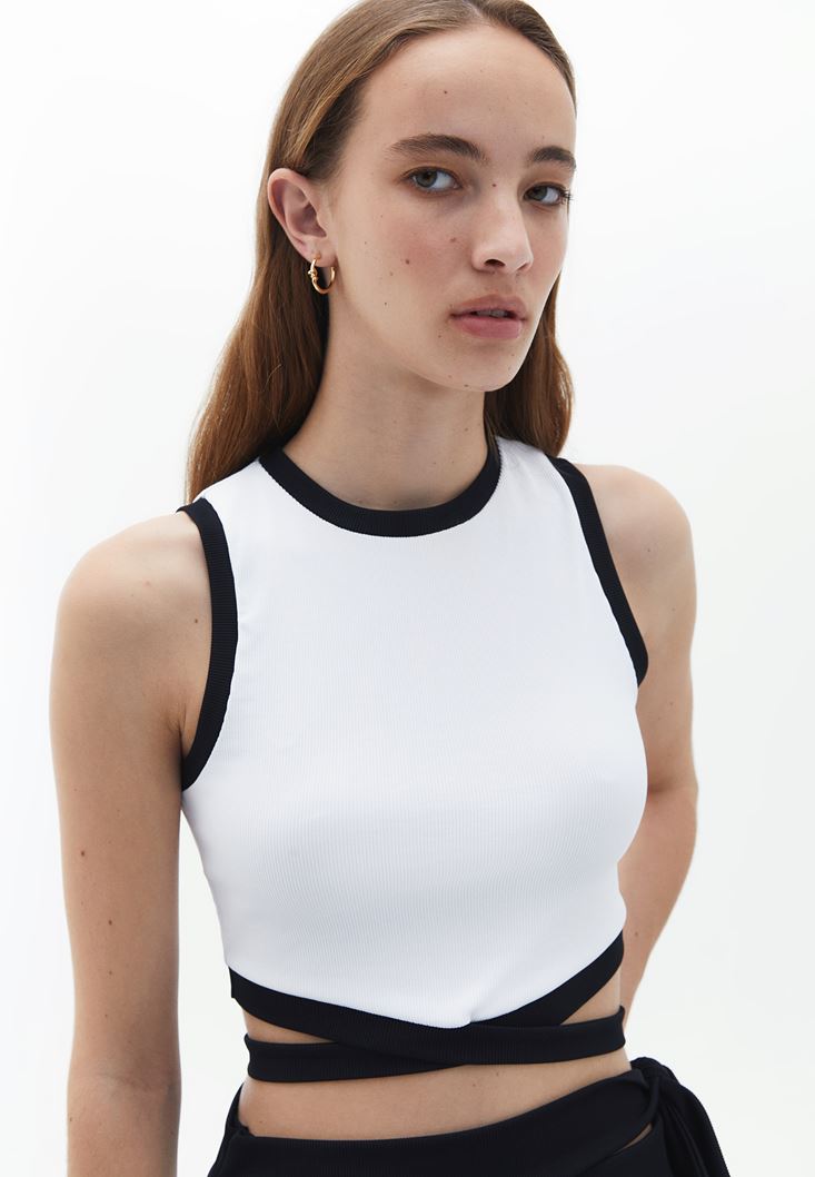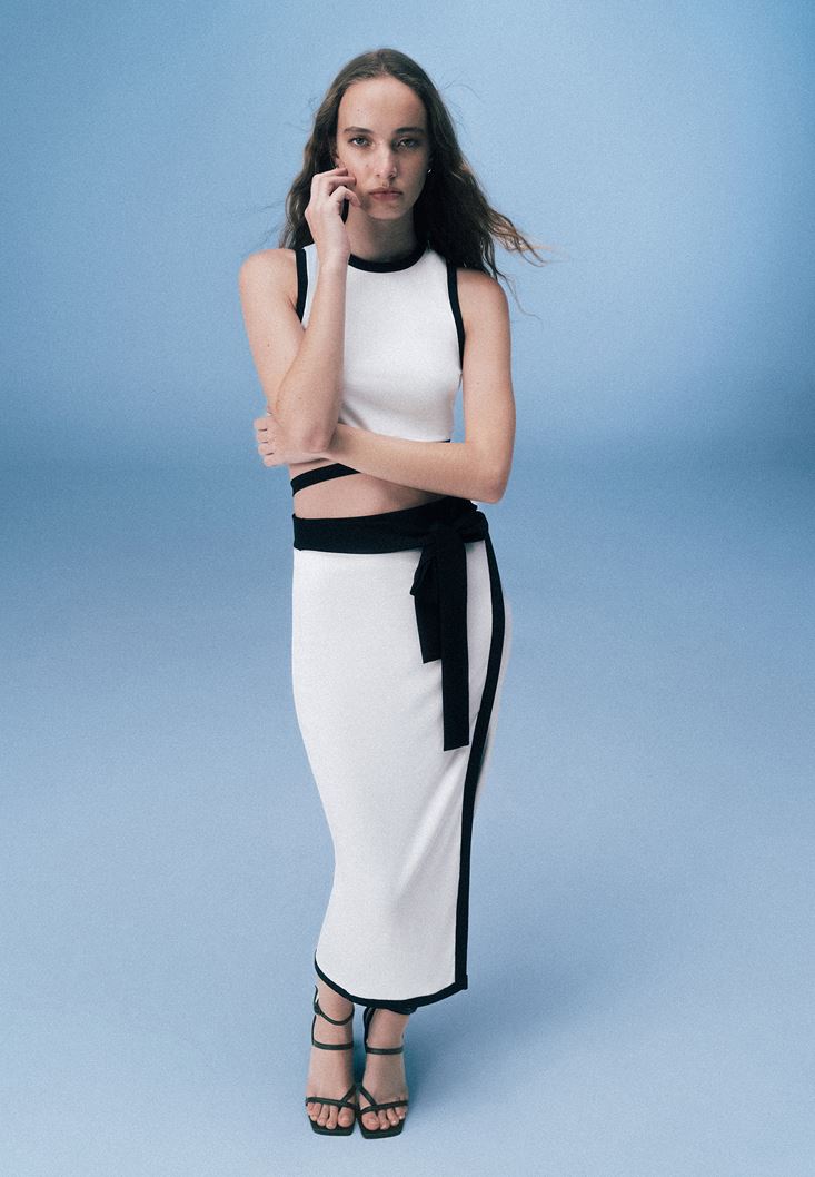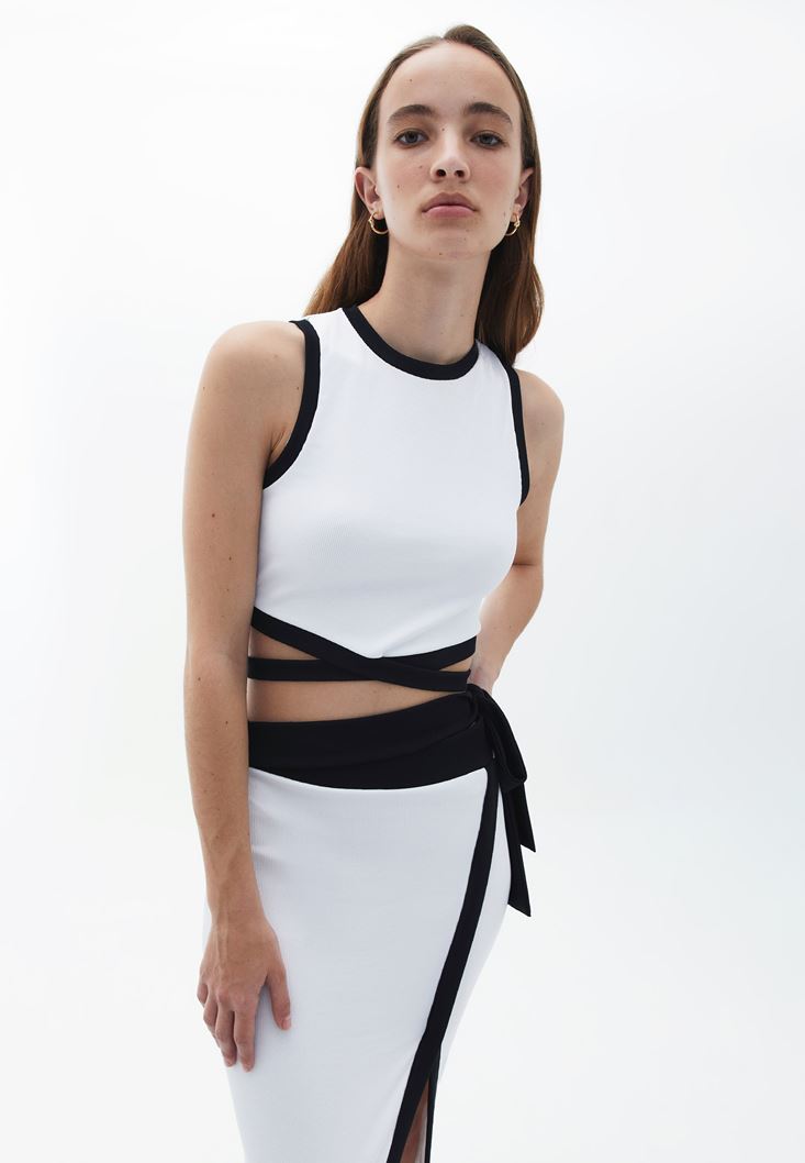 Bedeni saran esnek fit, sıfır yaka, crop kesim, beli bağlama detaylı, siyah beyaz kontrast renkli tasarım.