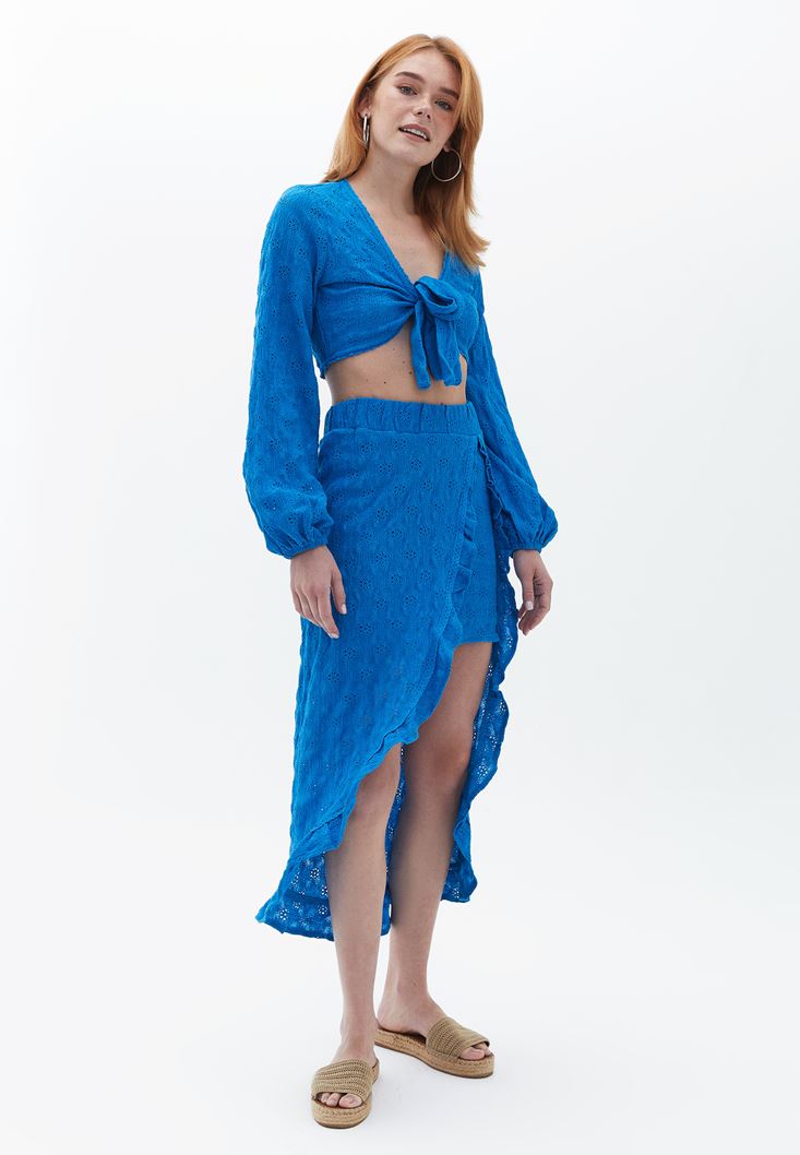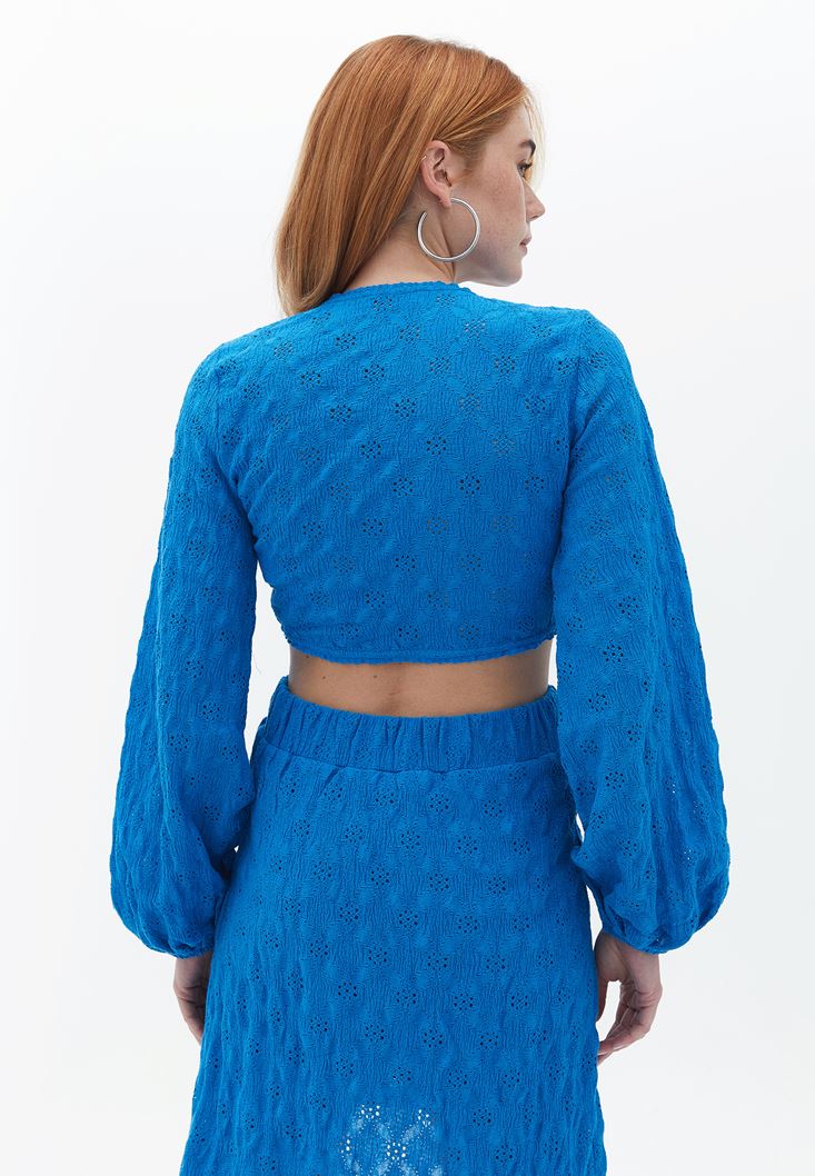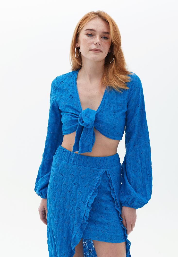 • Bayan Mavi Bağlama Detaylı Crop Bluz