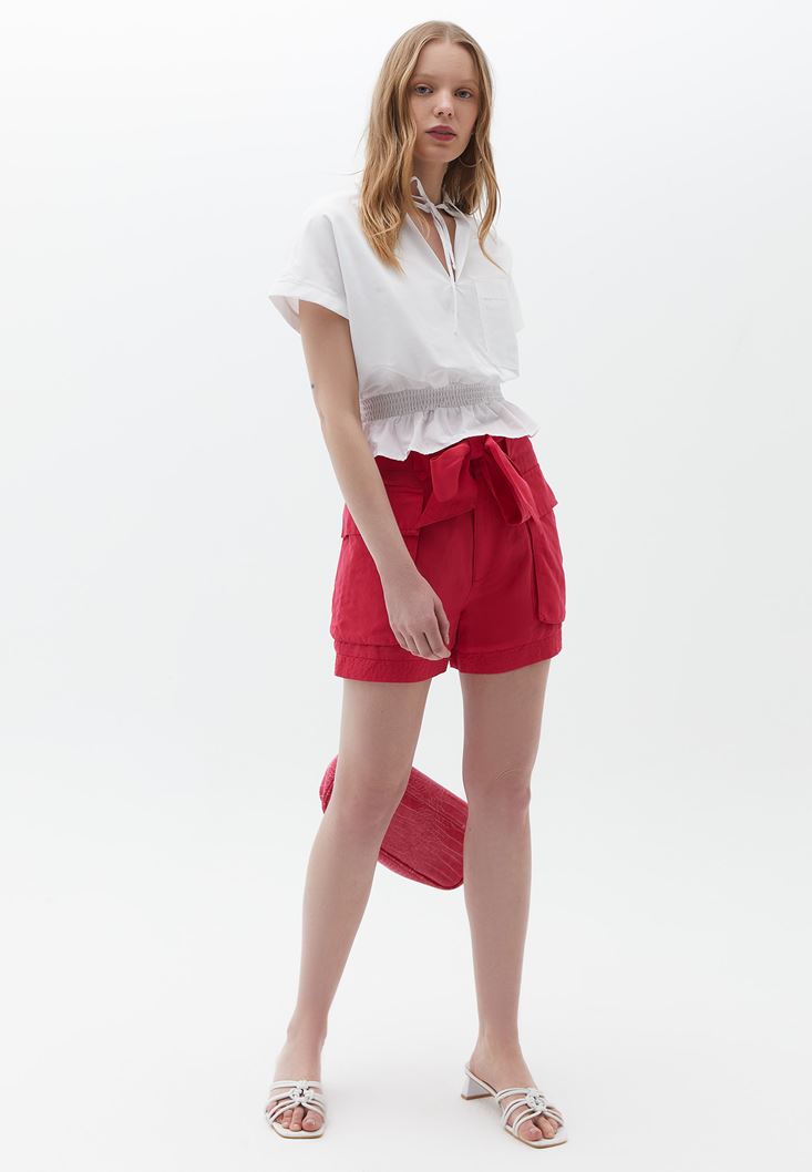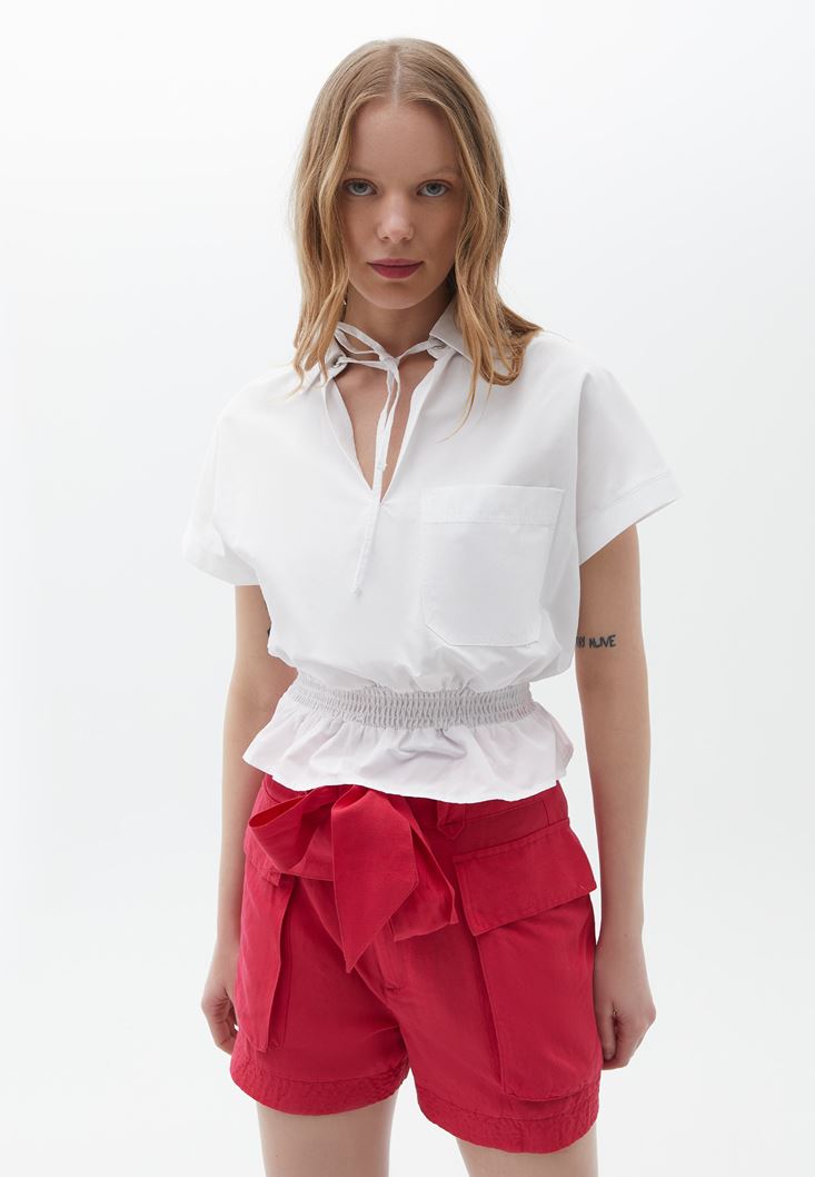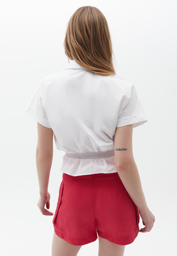 Pamuk karışımlı poplin kumaş, bağcıklı yaka, beli lastikli, kısa kollu, bedene yakın fit, ön kısmı tek cepli, crop kesim.
