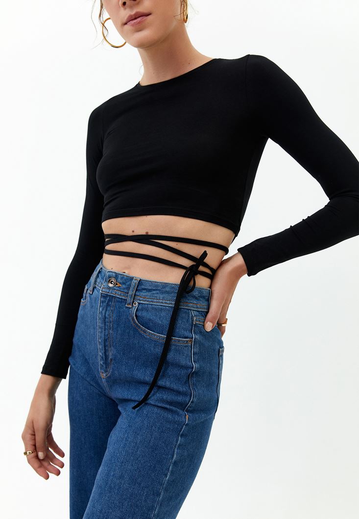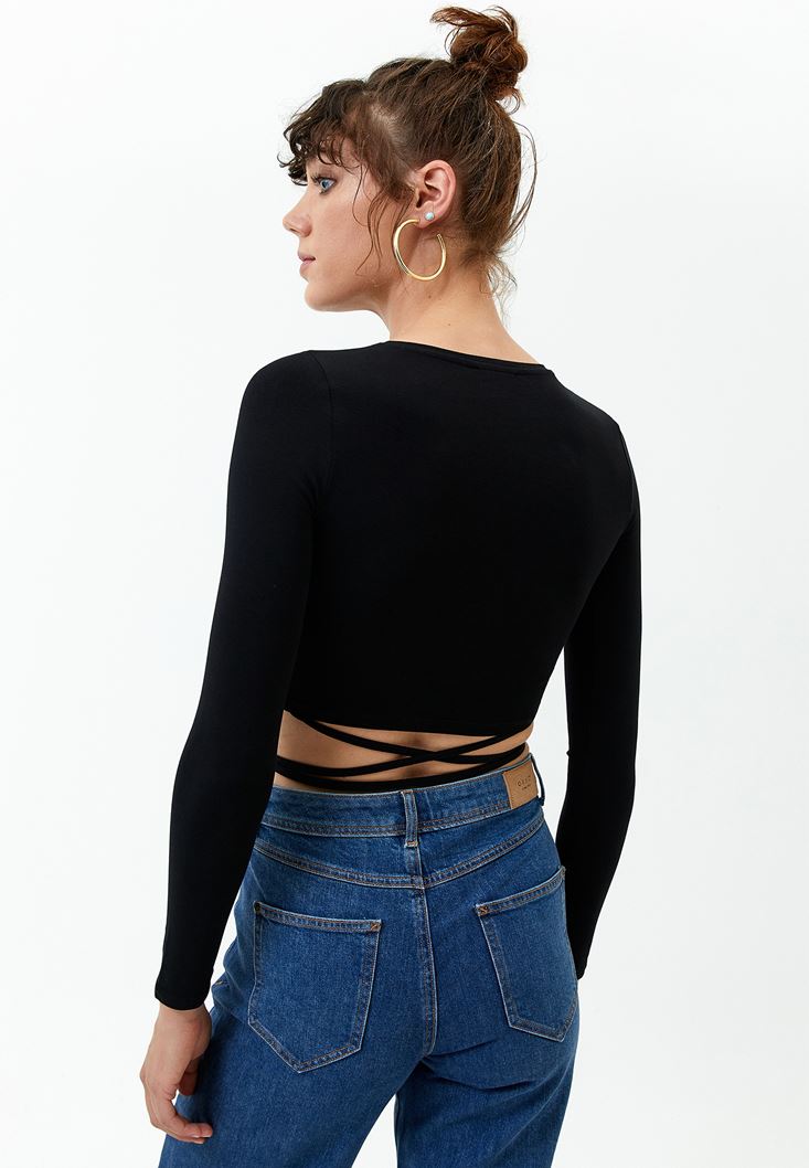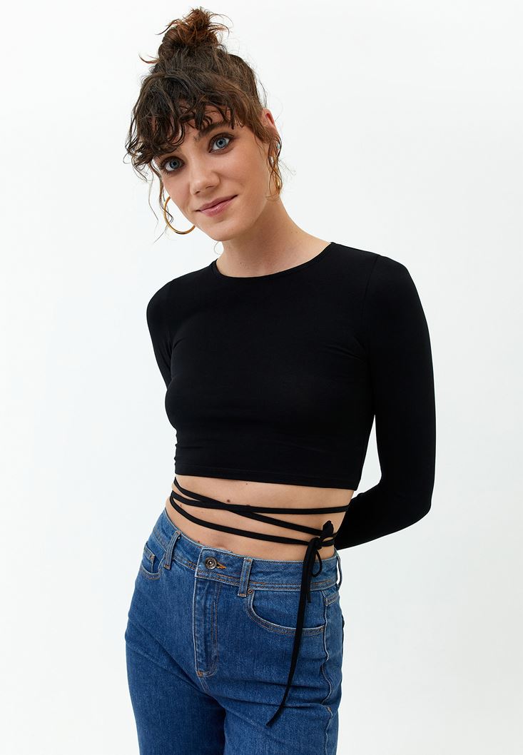• Bayan Siyah Bağlama Detaylı Crop Top