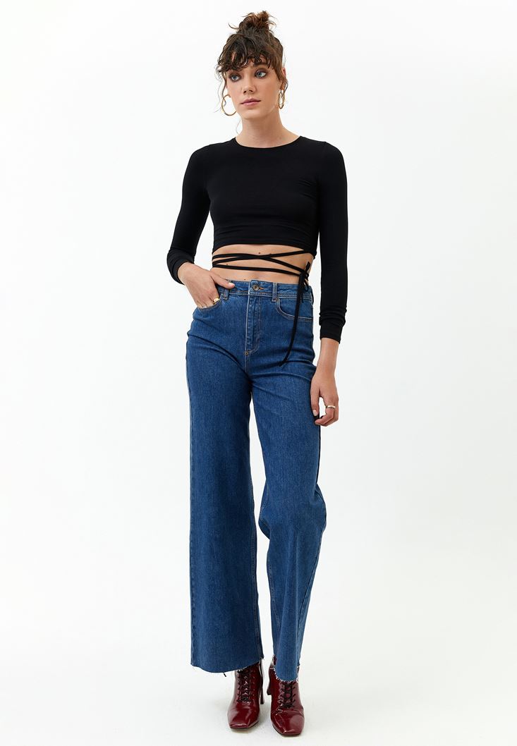 Pamuklu yumuşak doku, beli bağcık detaylı, crop kesim, uzun kollu, sıfır yaka, bedeni saran esnek form.