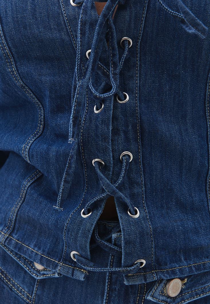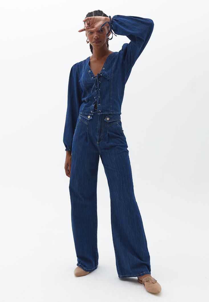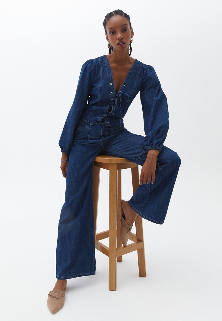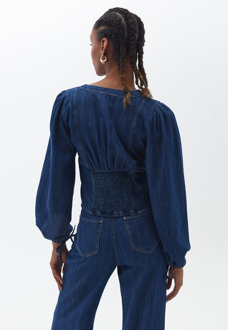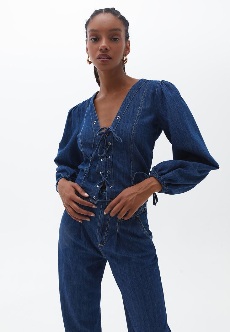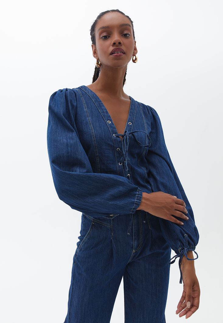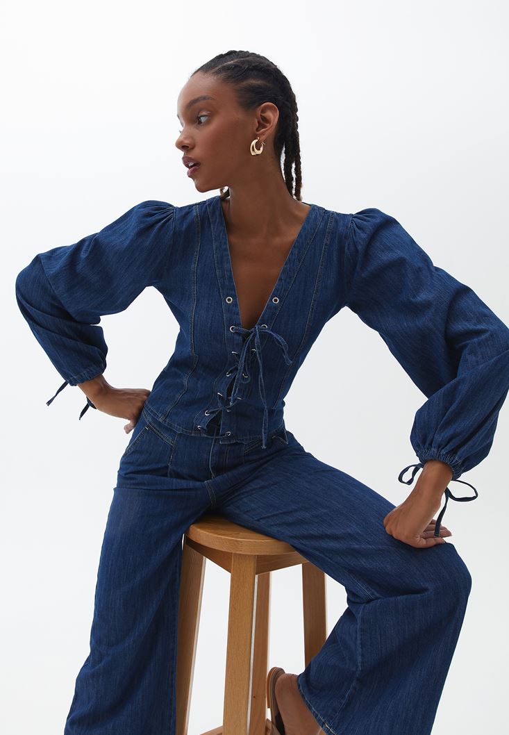 %100 pamuklu denim, balon kollu, ön kısmı bağcık kapamalı, kol ucu bağcıklı, crop kesim, sırt kısmı gipeli, V yaka, uzun kollu, bedene yakın fit.