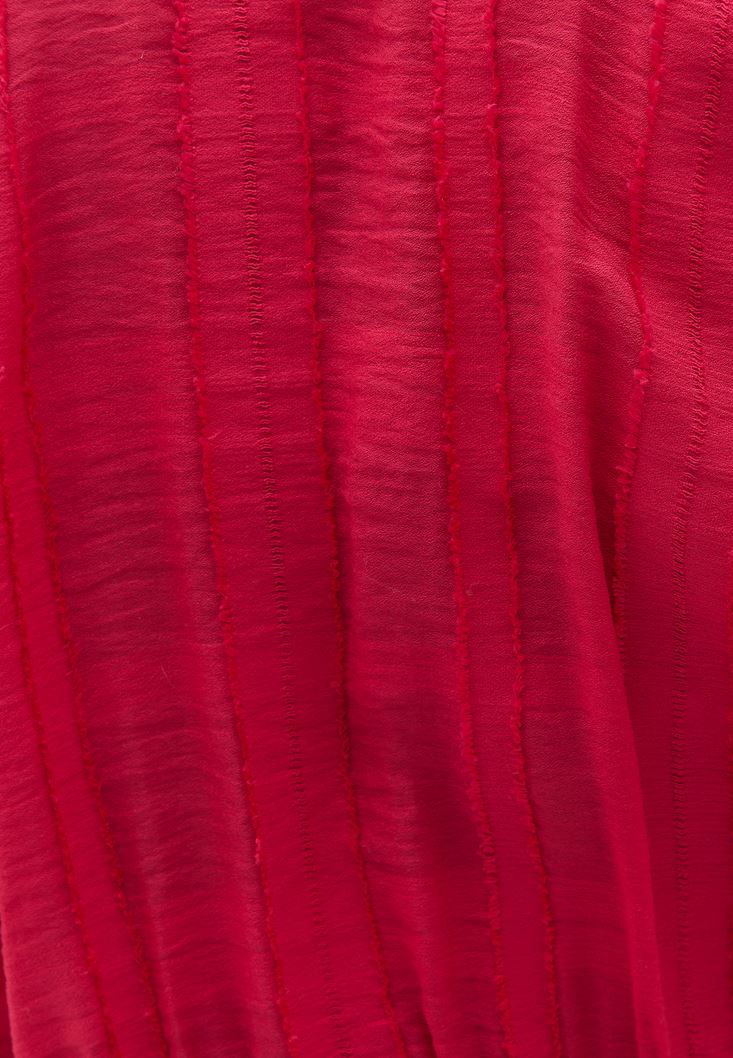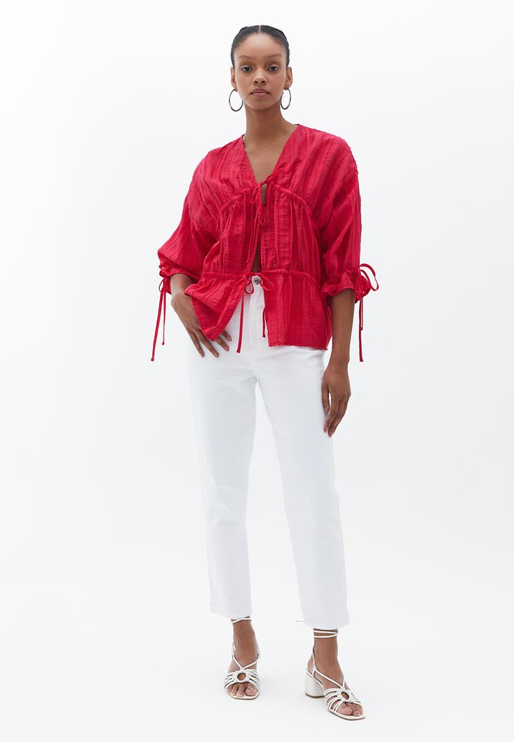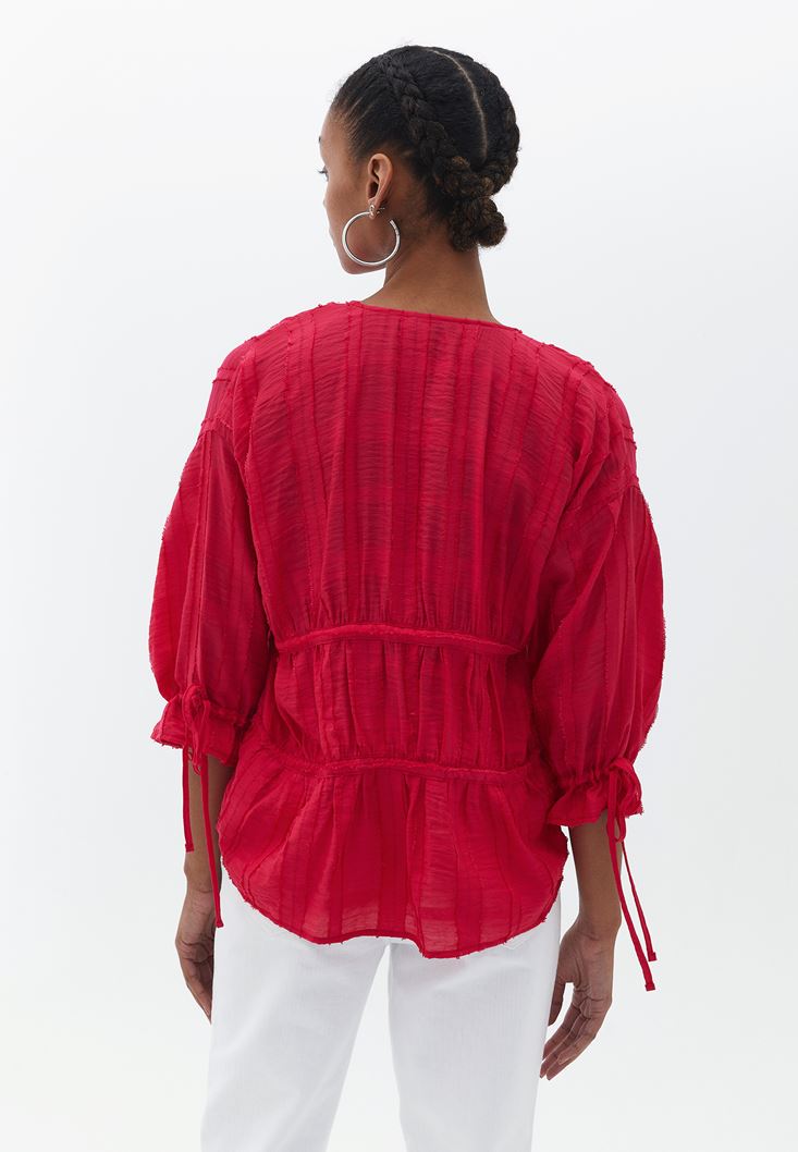 Viskon karışımlı doku, ön kısmı bağcıklı, büzgülü şekilde kullanılabilen tasarım, V yaka, uzun kollu, kol kısmı bağcıklı ve büzgülü, bedenden uzak rahat fit.
