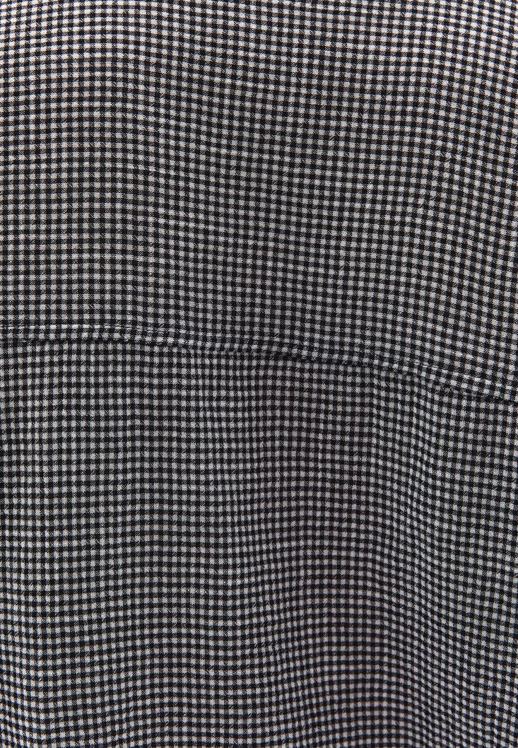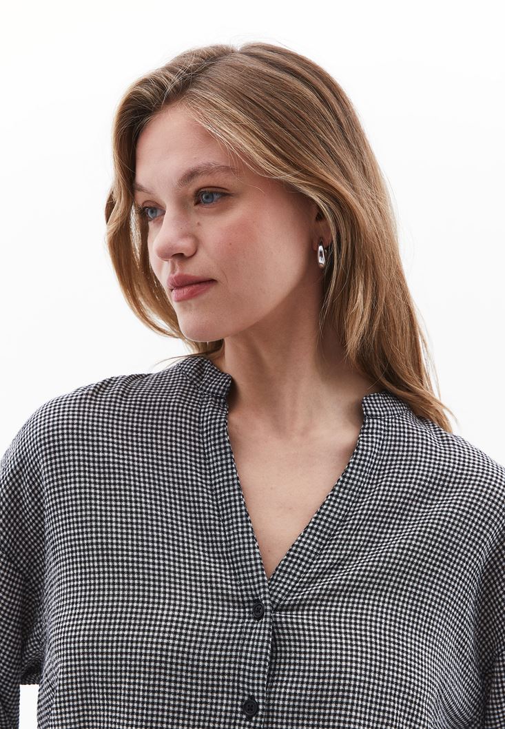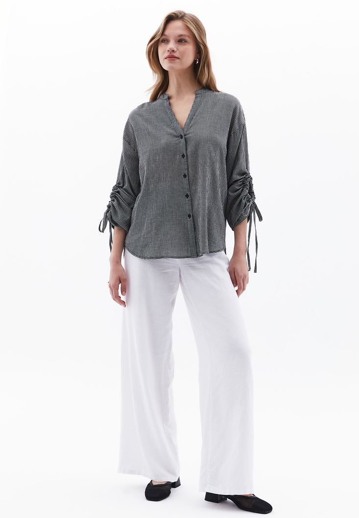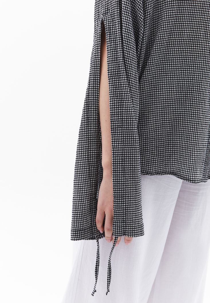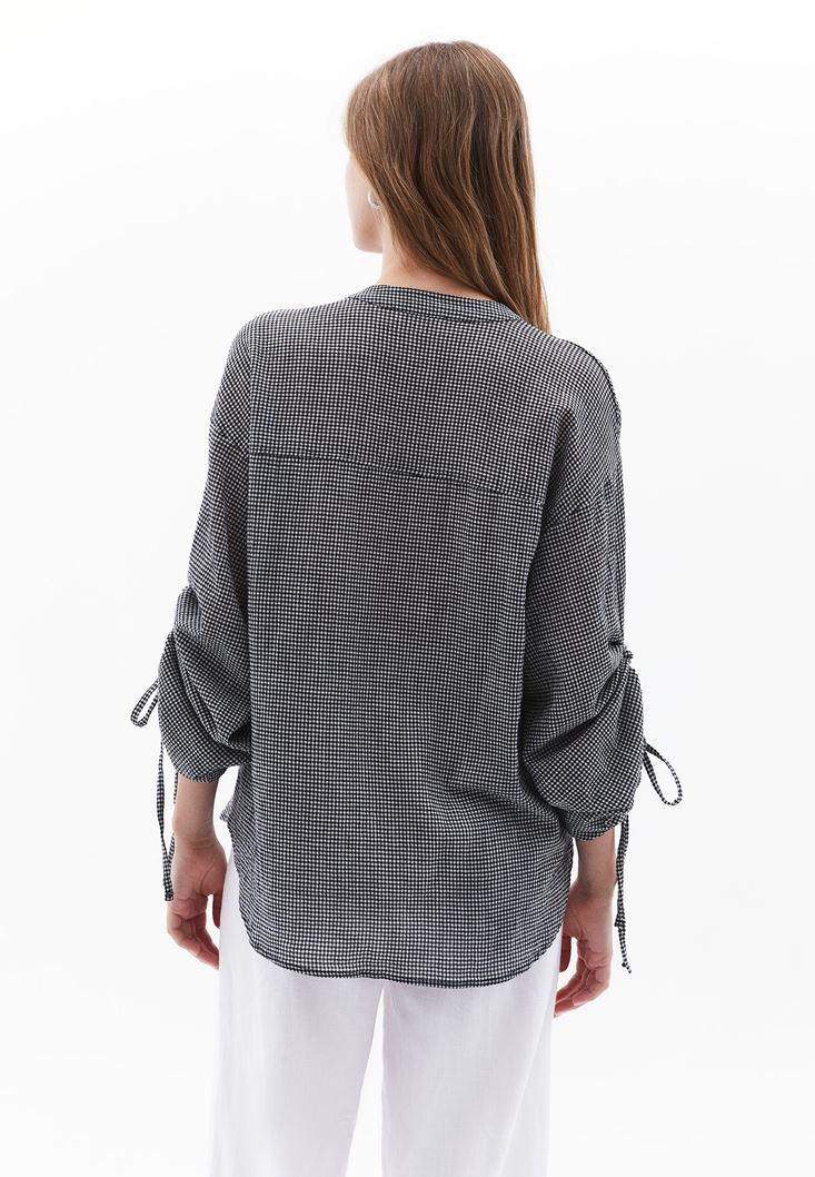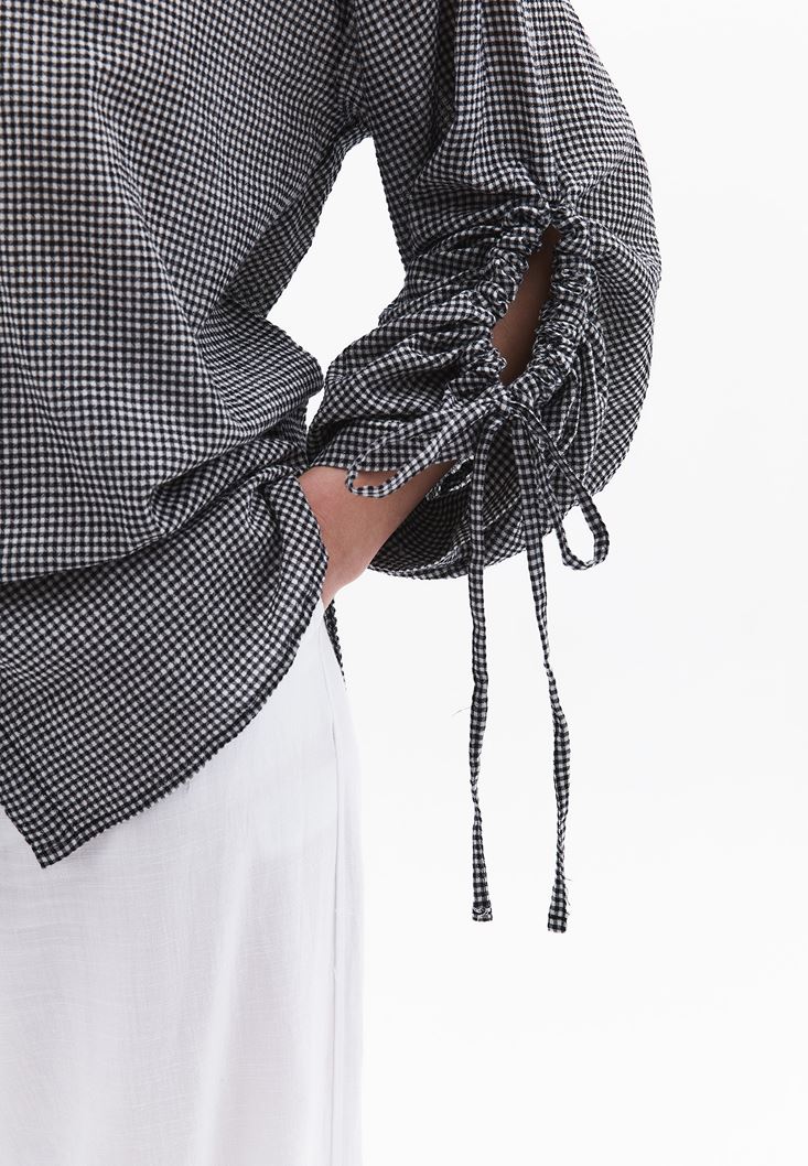 %100 pamuk içerikli doğal doku, hakim yaka, düğme kapamalı, kolları bağlanabilir büzgülü, bedenden uzak oversize fit, kol kısmı bağcıklar açık şekilde kullanılabilir, pötikare desenli.