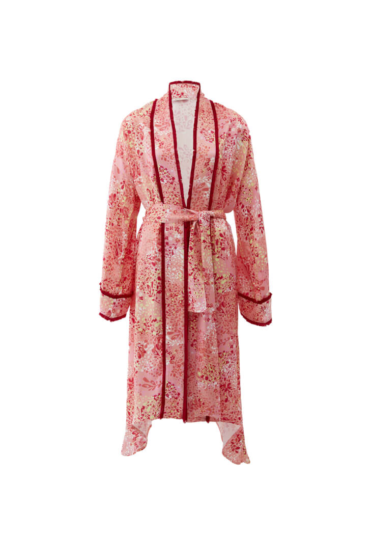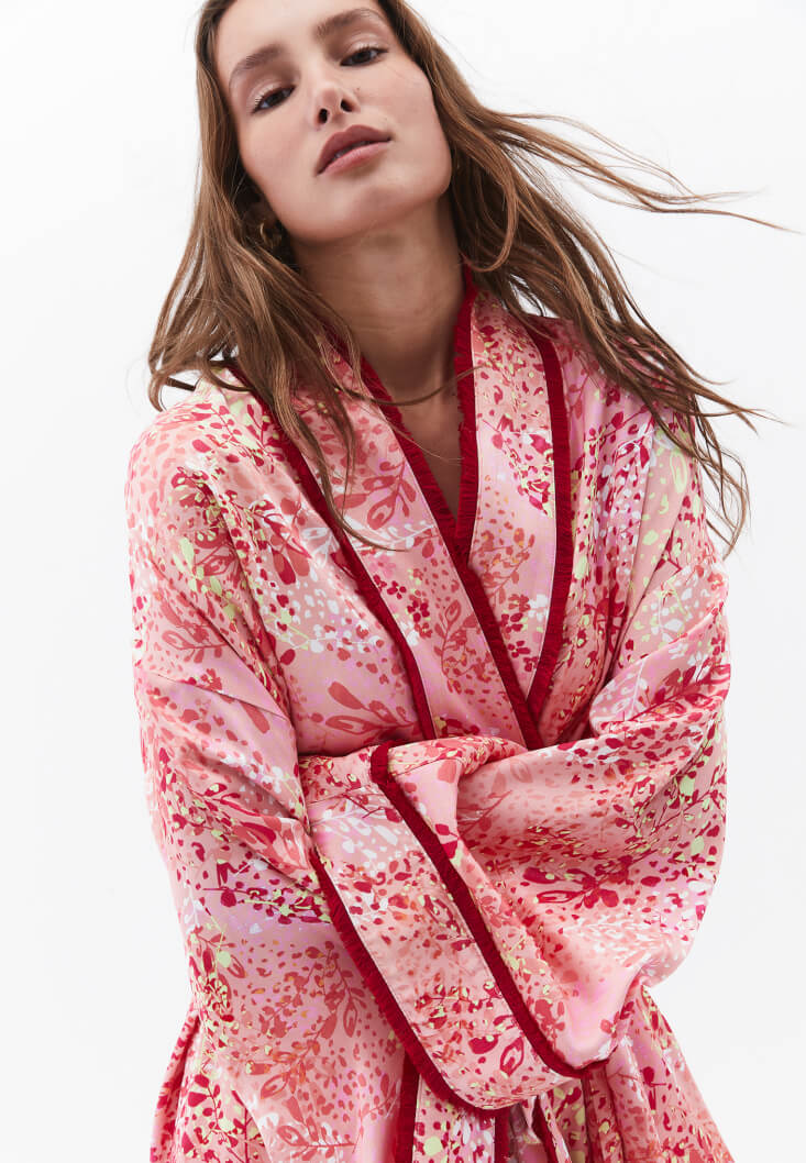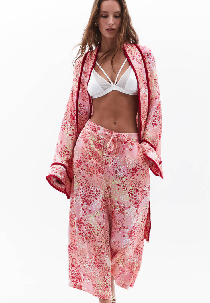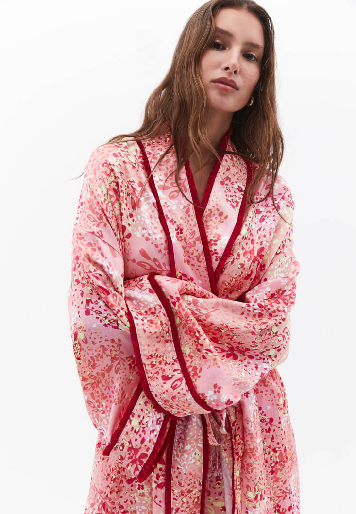 Canlı desenleri ve parlak saten dokusuyla öne çıkan bu oversize kimono, stilinize zarif ama iddialı bir dokunuş katıyor. Akışkan yapısı sayesinde vücuda yumuşakça otururken, bağlama detayı ile bel hattınızı vurgulayarak dengeleyici bir siluet oluşturur.