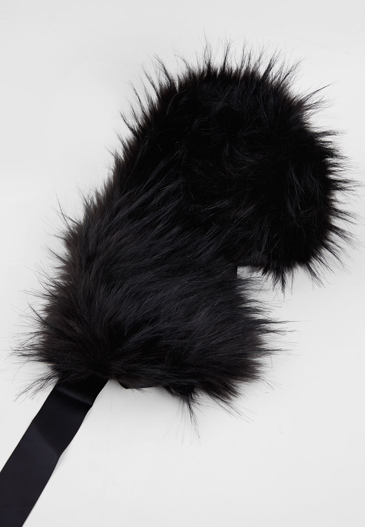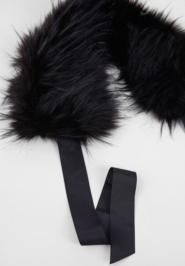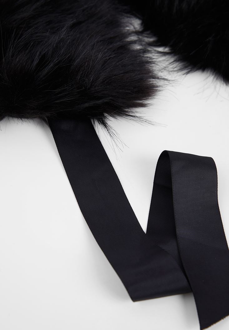 Siyah Bağlama Detaylı Suni Kürk Yaka