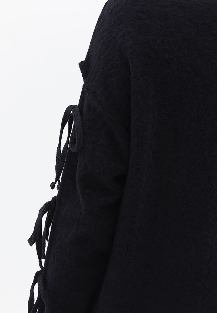 %100 pamuk içerikli doğal doku, sıfır yaka, bedenden uzak loose fit, kol boyunca bağcık detaylı.