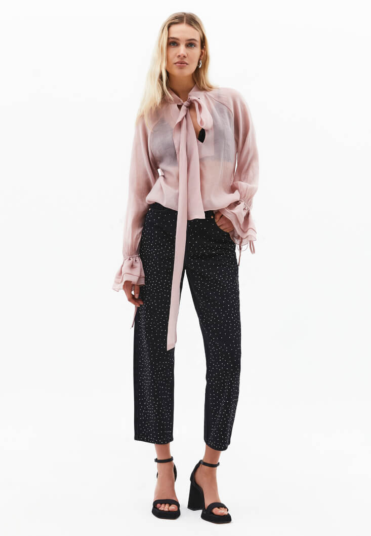 Bu bluzu, içindeki sade bir atlet veya body ile kullanarak şeffaflığını dengeleyin. Alt giyim olarak yüksek bel kumaş pantolonlar veya dar kesim etekler ile eşleştirerek ofis şıklığından özel davetlere uzanan bir stil yaratabilirsiniz. Oversize bir blazer ceket altına giyerek, bluzun dokusal zenginliğini ve bağlama detaylarını ön plana çıkarın.