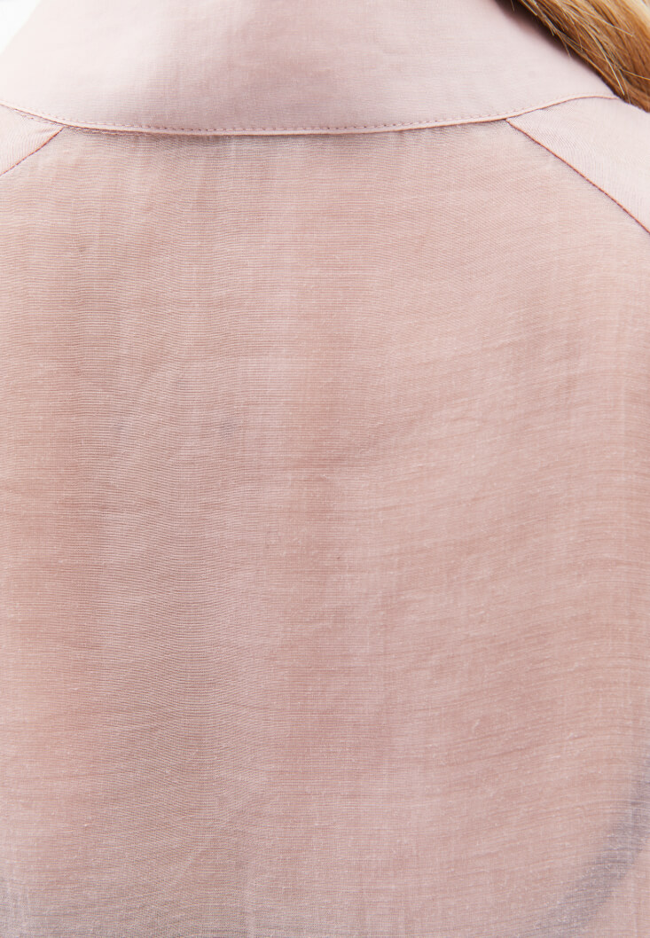 Bluzun hafif ve akışkan tül dokusu, romantik bir hava katarken, pembenin yumuşak tonu zarafeti vurgular. Manşet ve yaka kısmındaki bağlama detayları, parçanın hareketliliğini artırarak giyime kişisel bir dokunuş katma imkanı verir. Dökümlü kesimi ve zarif şeffaflığıyla, dikkat çekici ama abartısız bir duruş sergiler.