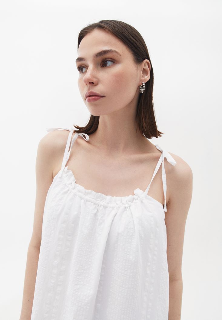 %100 pamuk içerikli doğal doku, U yaka, bağlanabilir askılı, yakası ve sırt kısmı büzgü detaylı, uzun boy, içi astarlı, bedenden uzak rahat fit.