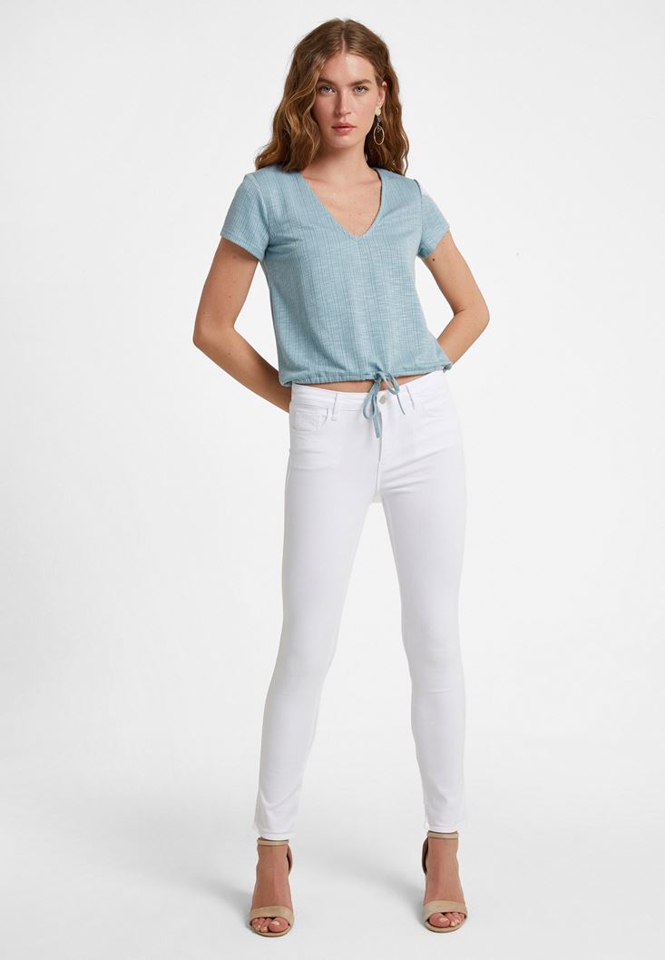 • Bayan Mavi Bağlama Detaylı V Yaka Tişört