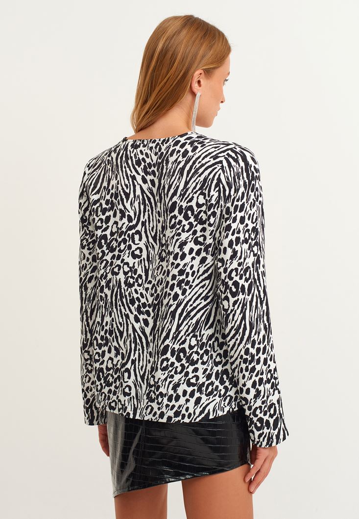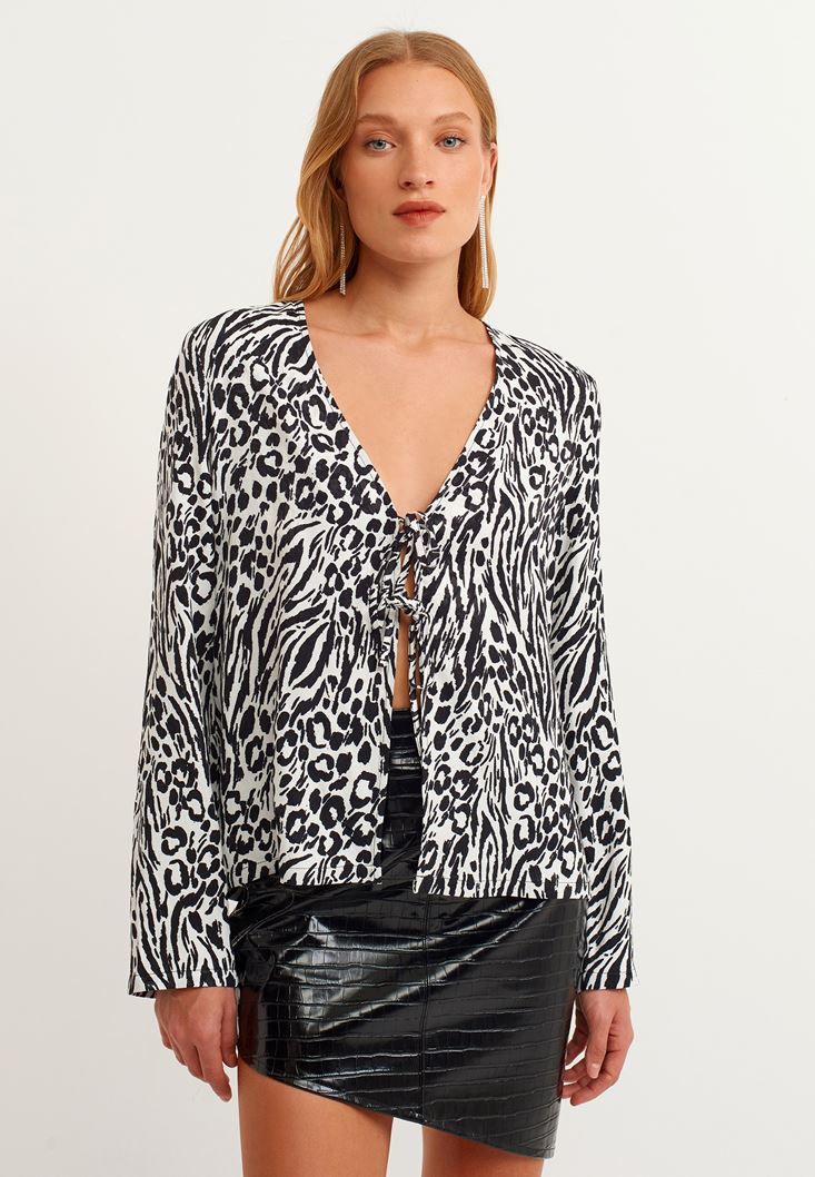 %100 viskon içerikli doku, V yaka, mix desenli, ön kısmı bağlama detaylı, uzun kollu, bedenden uzak rahat fit.