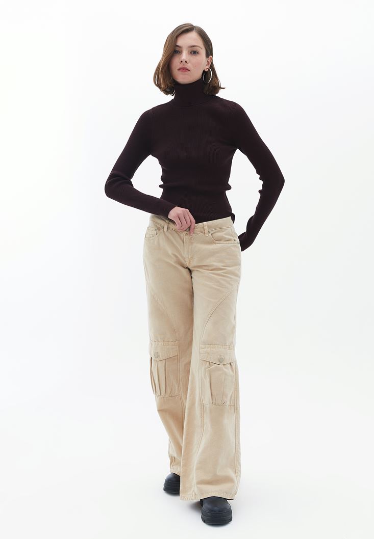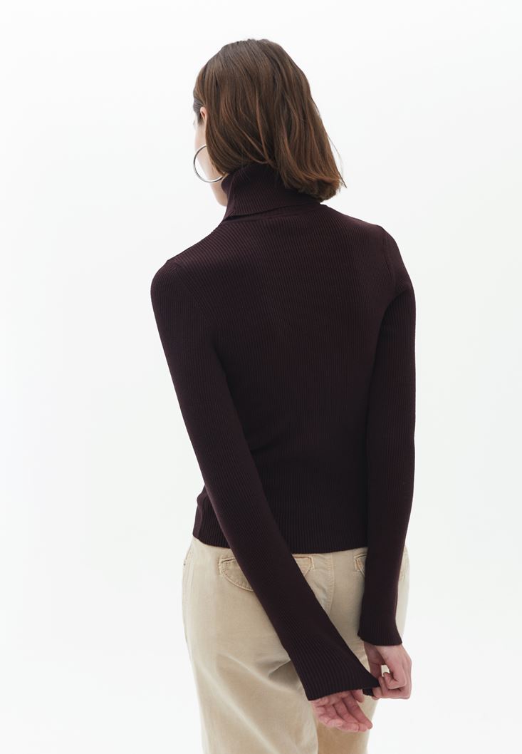 Viskon karışımlı triko, balıkçı yaka, fitilli örgü, uzun kollu, bedeni saran esnek fit, standart boy.