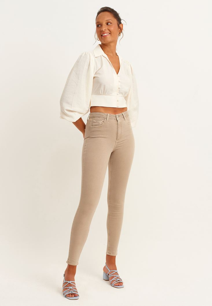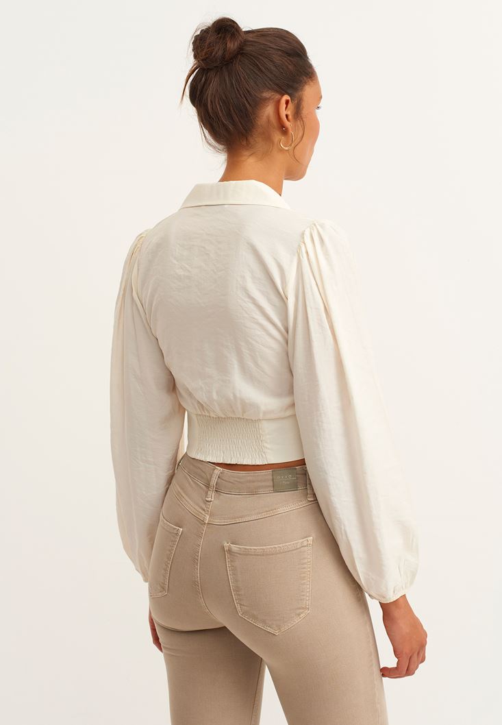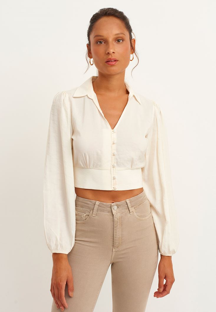• Bayan Krem Balon Kol Crop Bluz ( TENCEL™ )