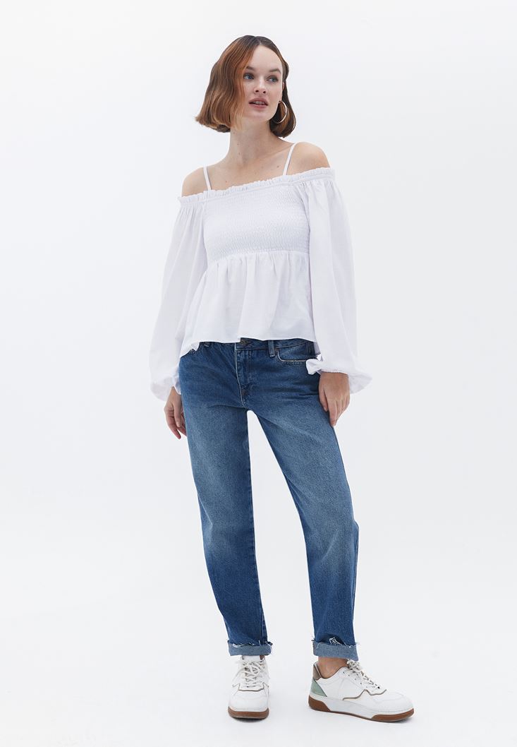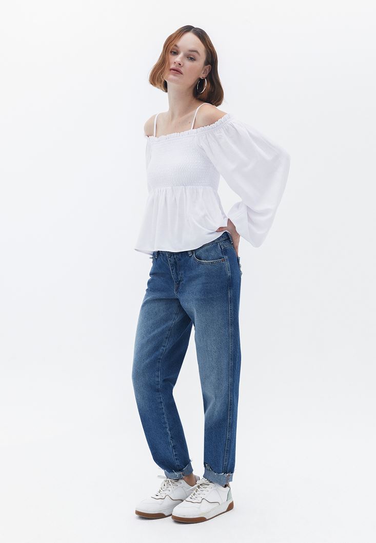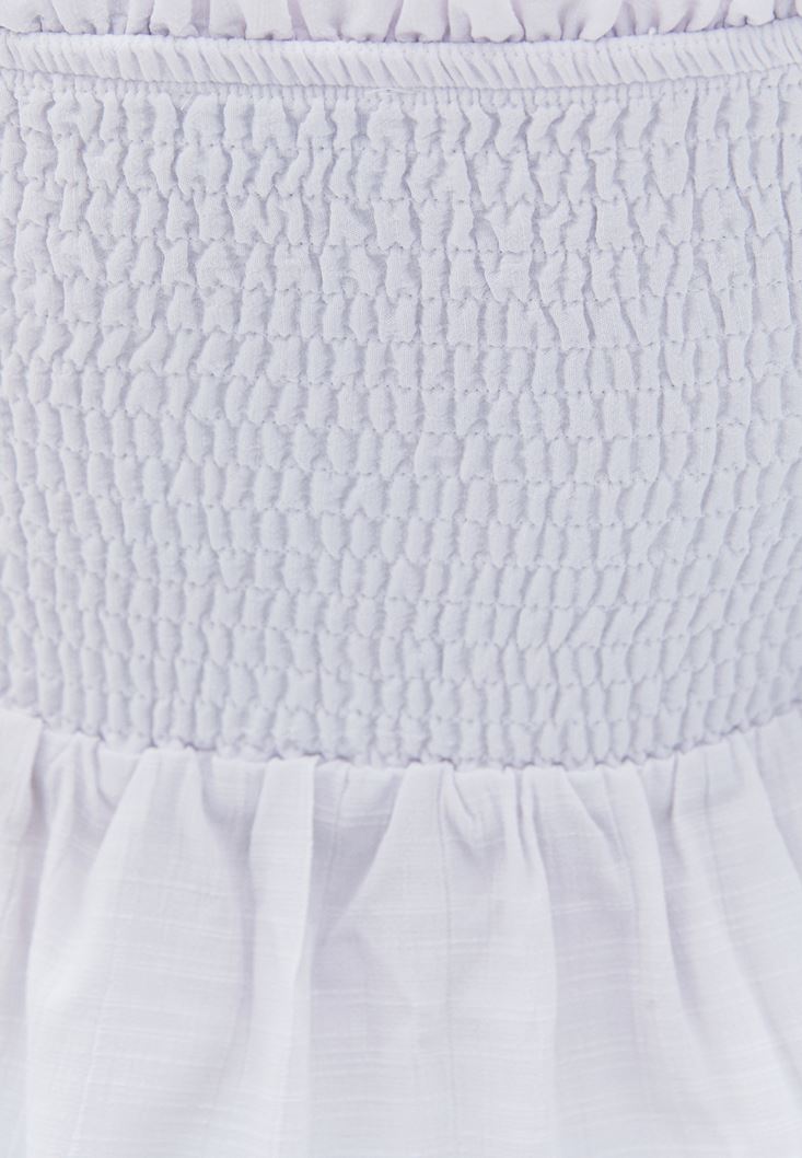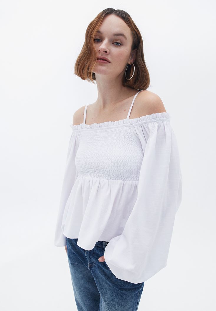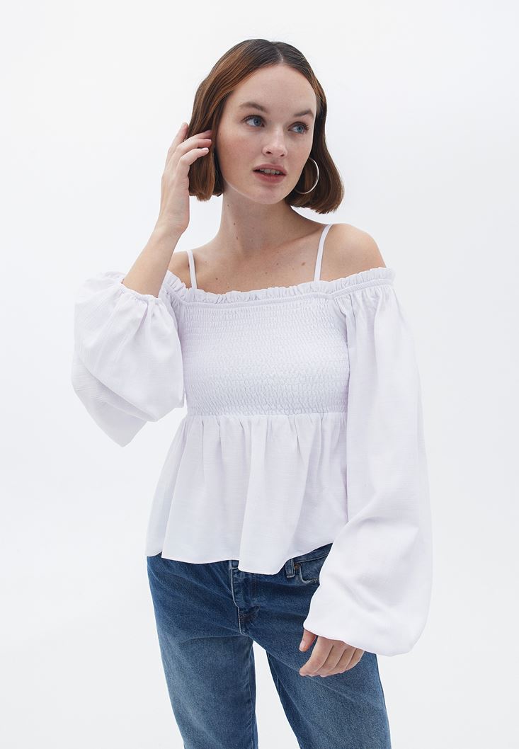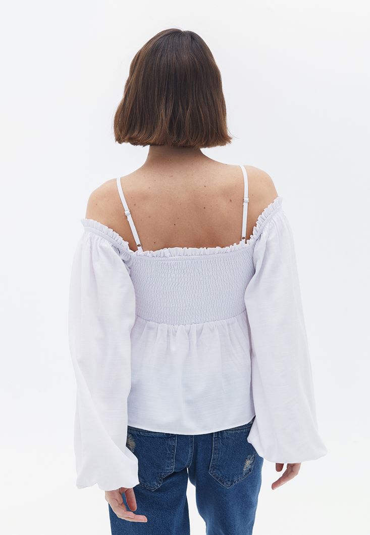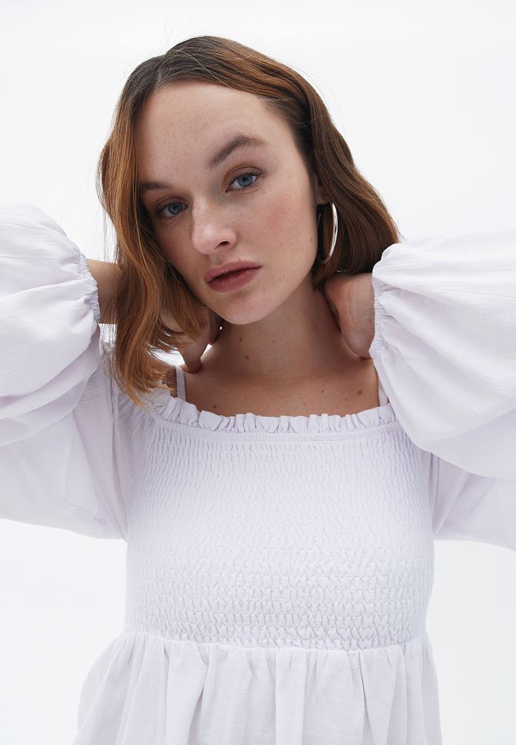 Viskon karışımlı doku, ince askılı, üst kısmı esnek gipeli, uzun kollu, balon kollu ve kol ucu lastikli.