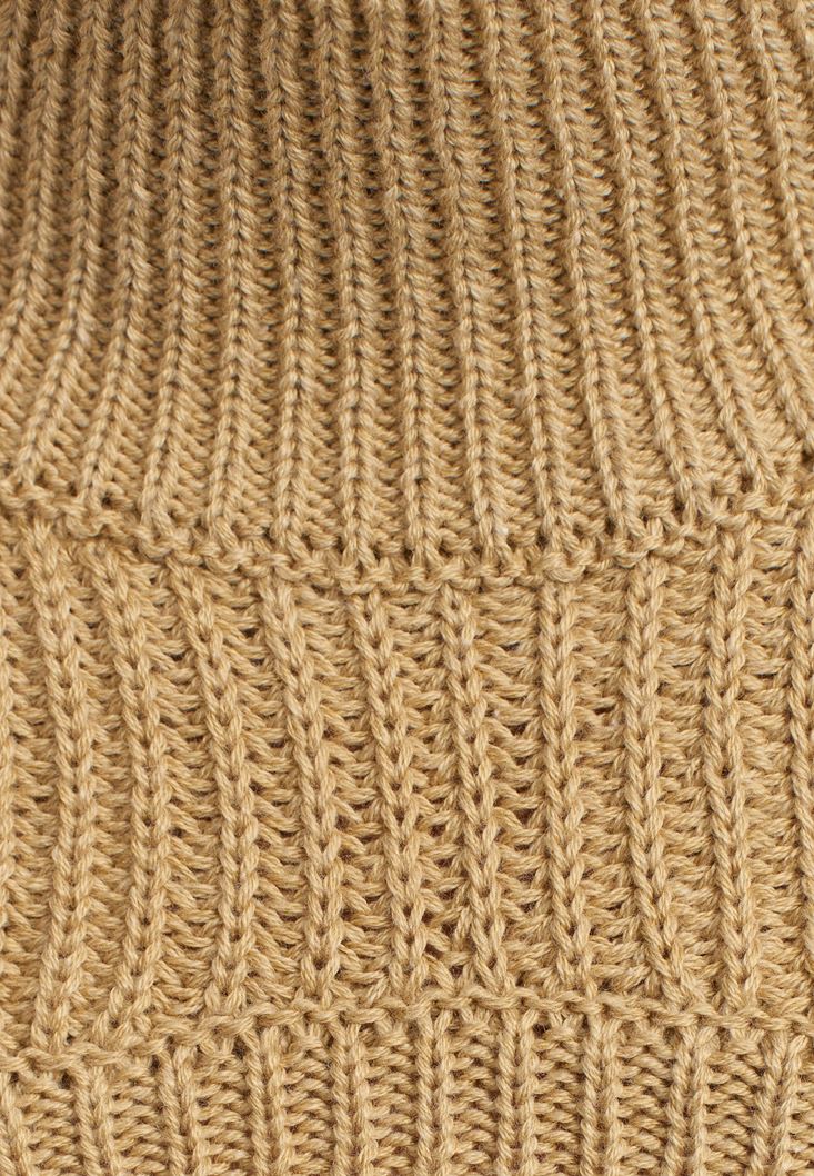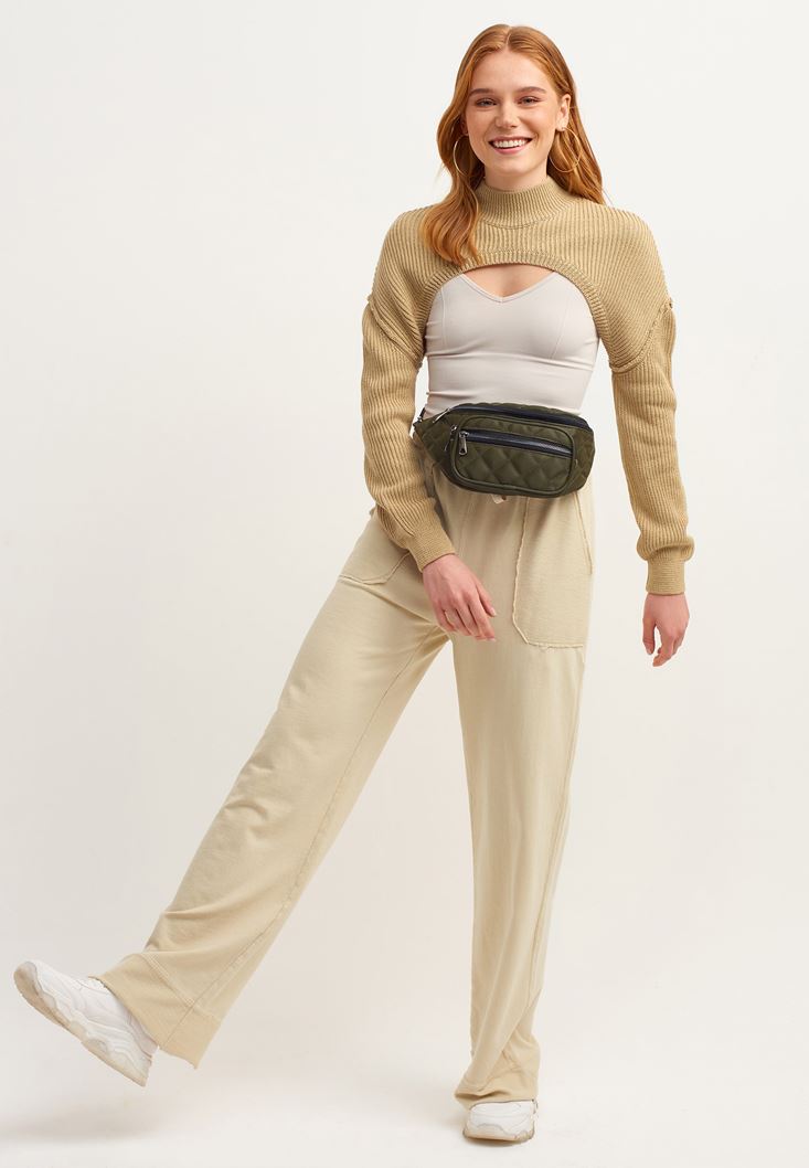 Pamuk karışımlı ve fitilli özel triko, yüksek yaka, uzun kollu, bedene yakın fit, balon kol tasarımlı.