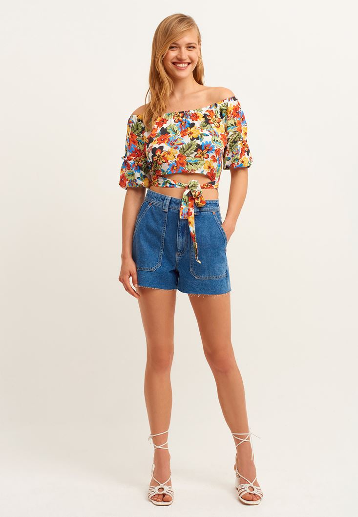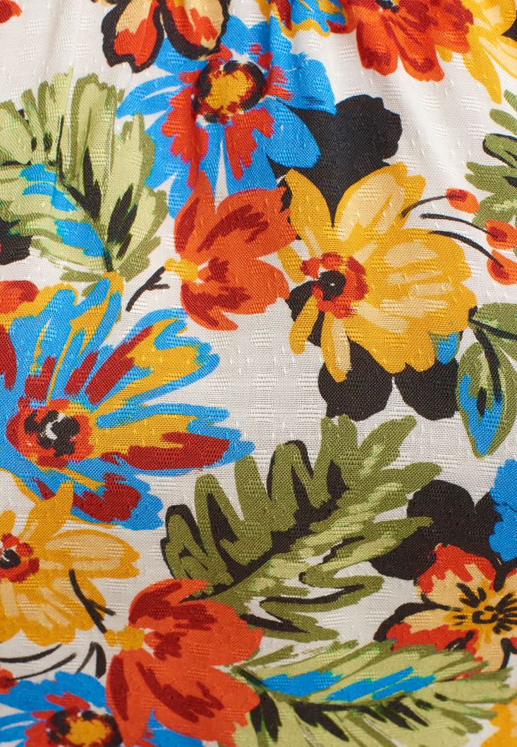 %100 viskon içerikli, düşük omuz, floral desenli, omuz kısmı lastikli, beli bağlama detaylı, crop kesim, balon kollu.