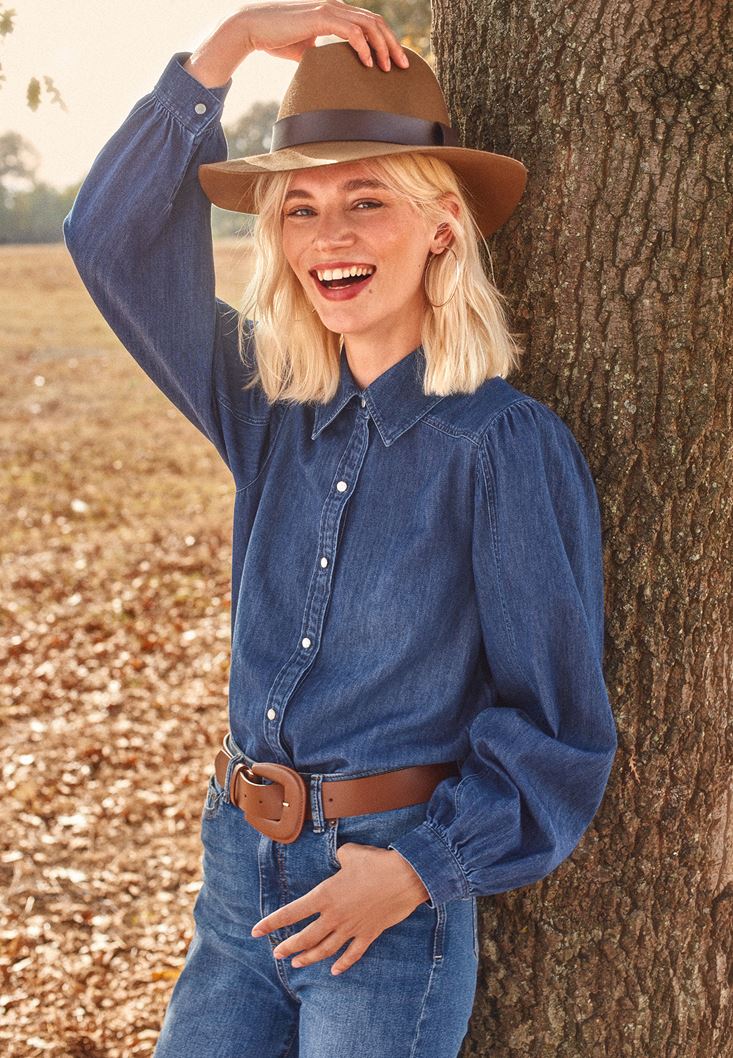 • Bayan Mavi Balon Kollu Denim Gömlek