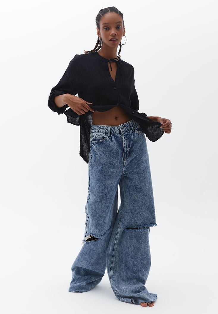 Pamuk karışımlı özel doku, balon kollu, bedenden uzak rahat fit, uzun kollu, yakası bağcık detaylı, hakim yaka tasarım, önü kısa arkası uzun asimetrik kesim.