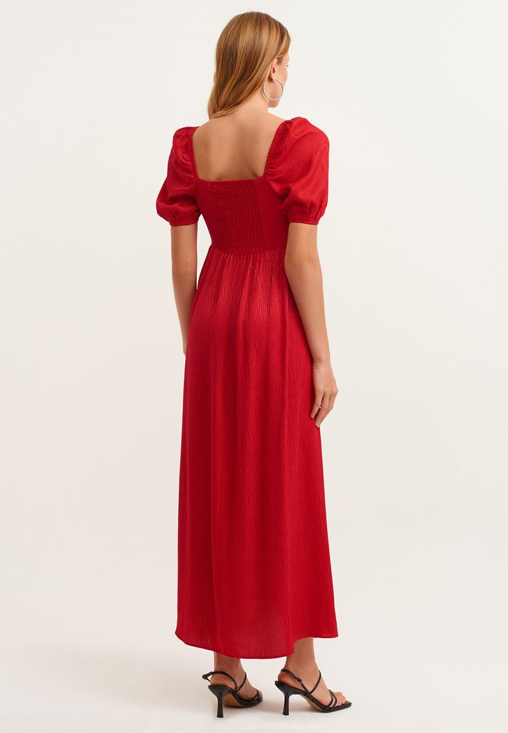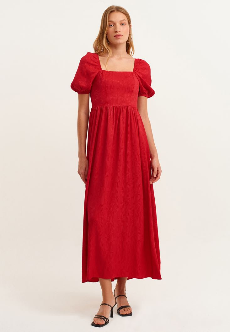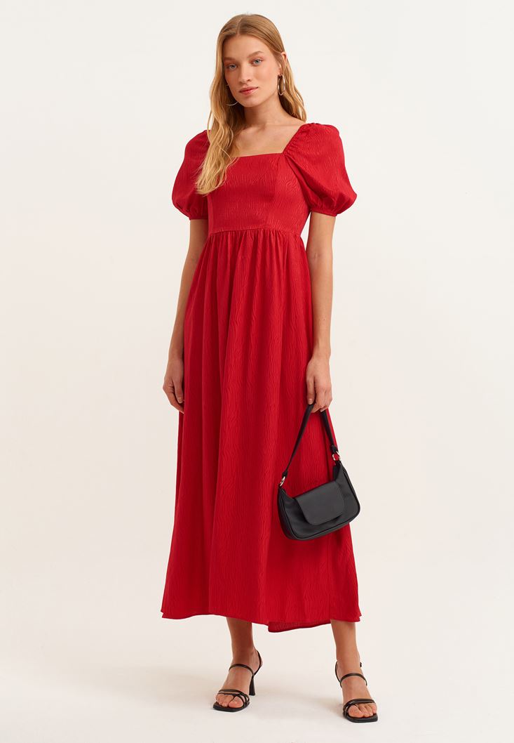 • Bayan Kırmızı Balon Kollu Jakarlı Elbise
