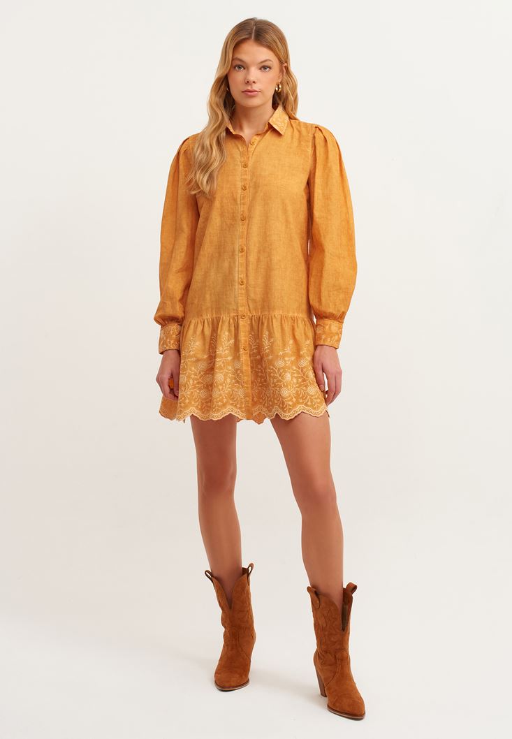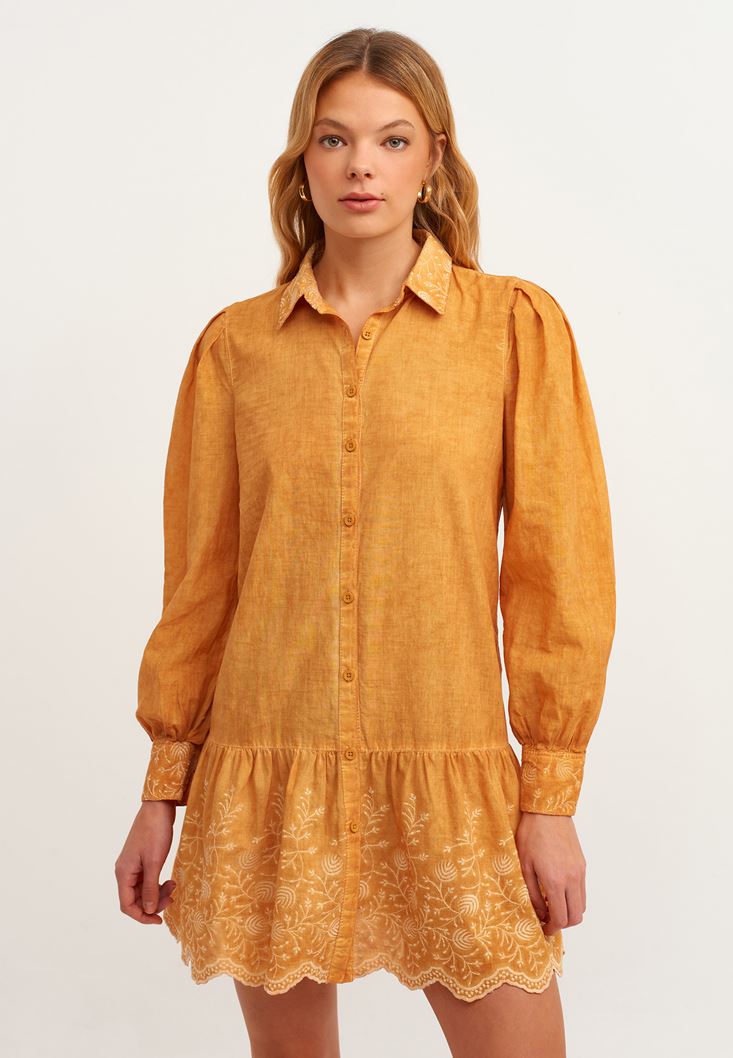 Turuncu Balon Kollu Kısa Gömlek Elbise