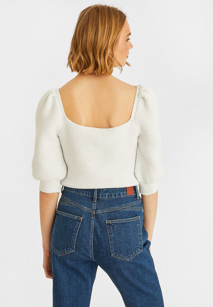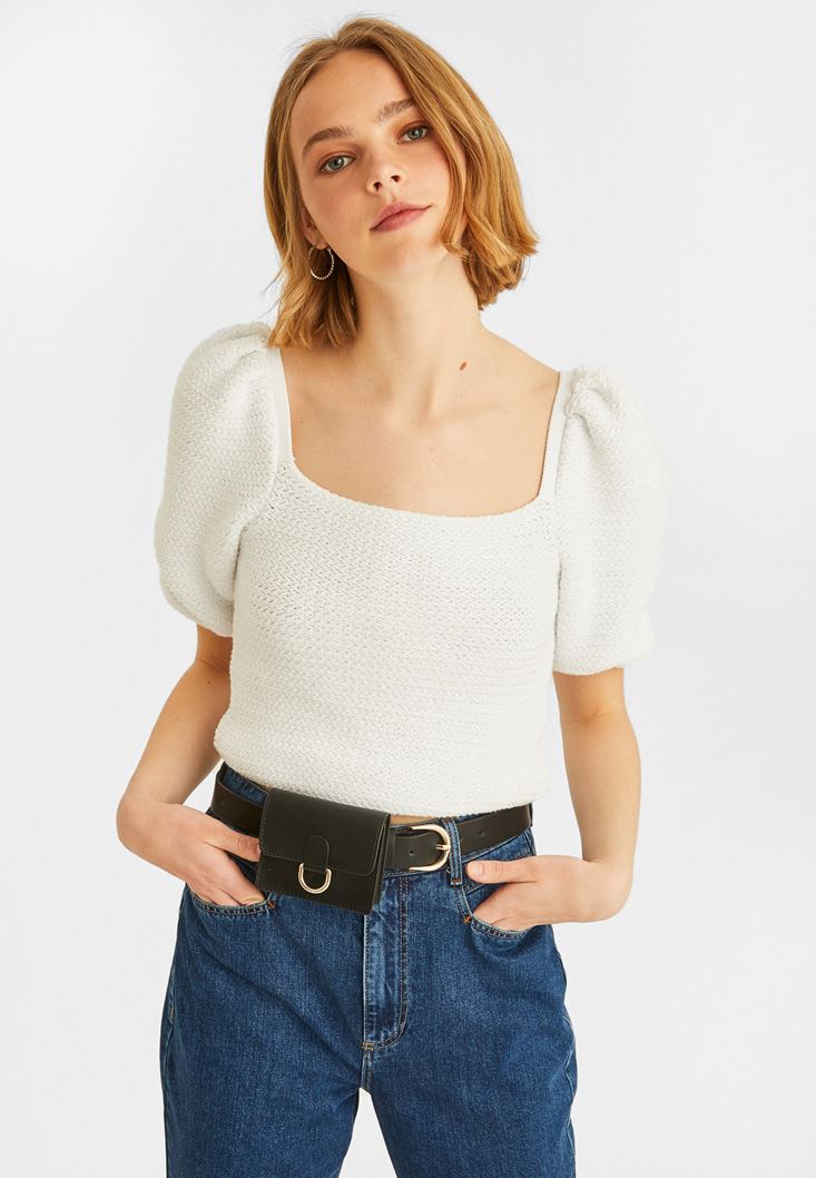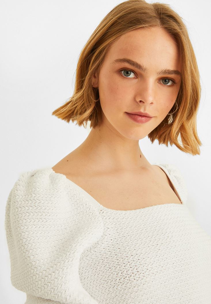 • Bayan Beyaz Balon Kollu Kısa Kazak