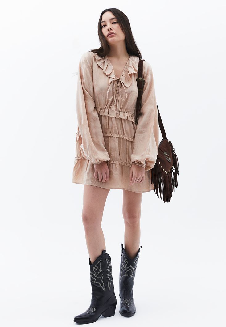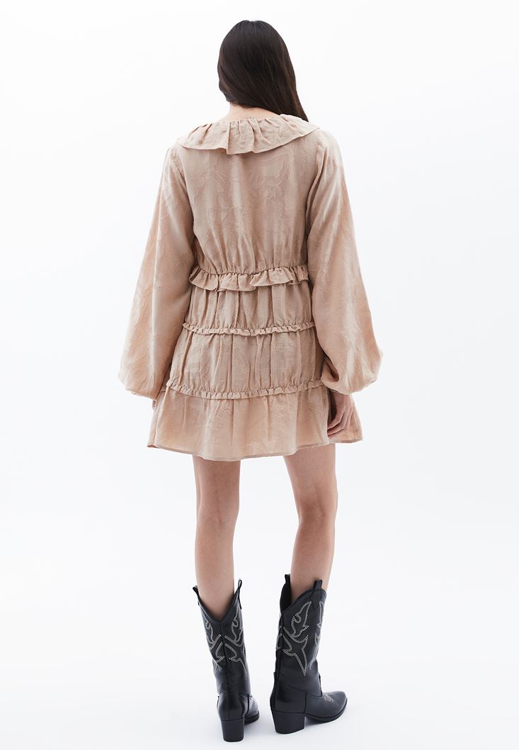 • Bayan Bej Balon Kollu Mini Elbise ( TENCEL™ )