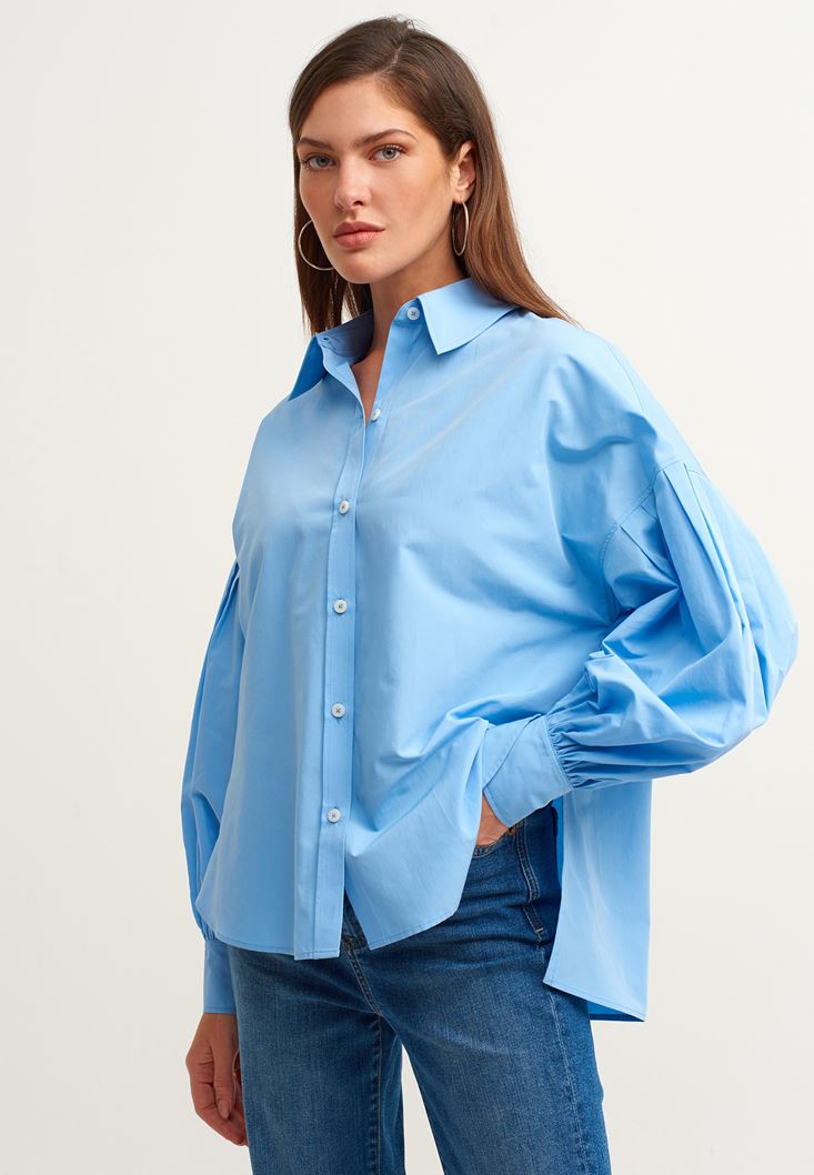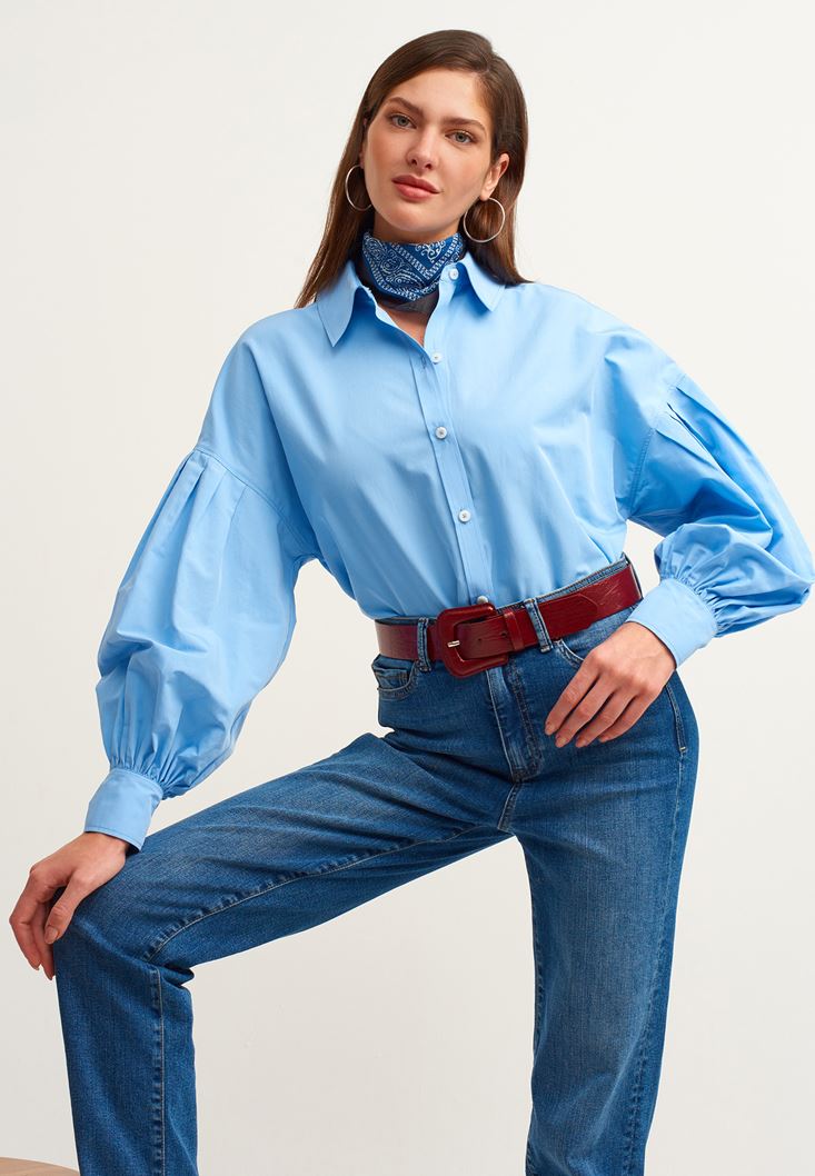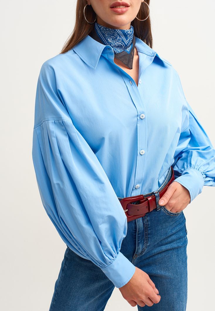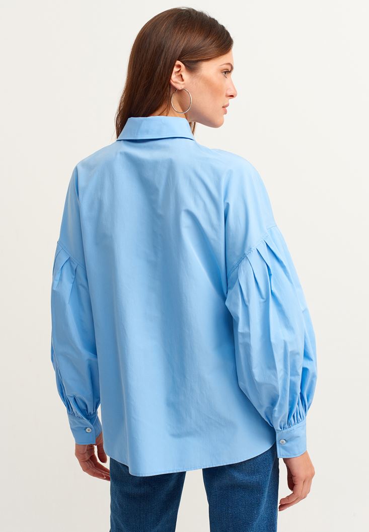 • Bayan Mavi Balon Kollu Pileli Poplin Gömlek