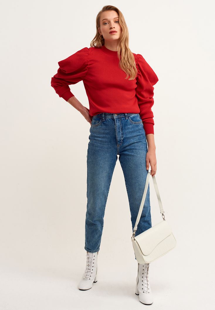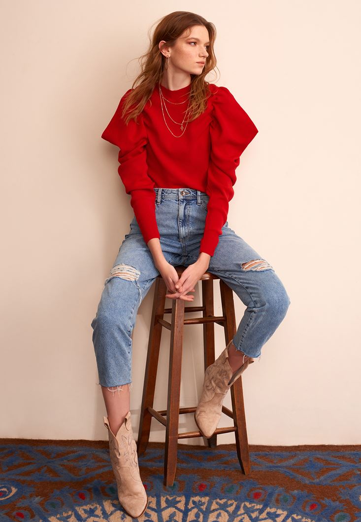 Viskon karışımlı triko, sıfır yaka, hacimli balon kol tasarımı, standart boy, bedene yakın close-fit.