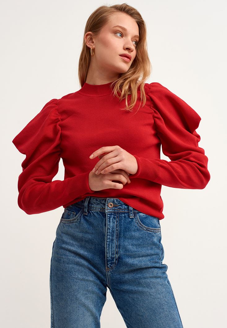 • Bayan Bordo Balon Kollu Sıfır Yaka Triko