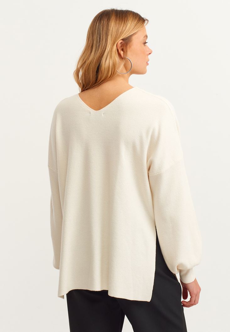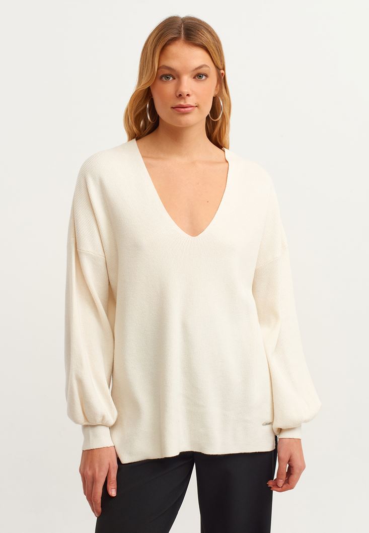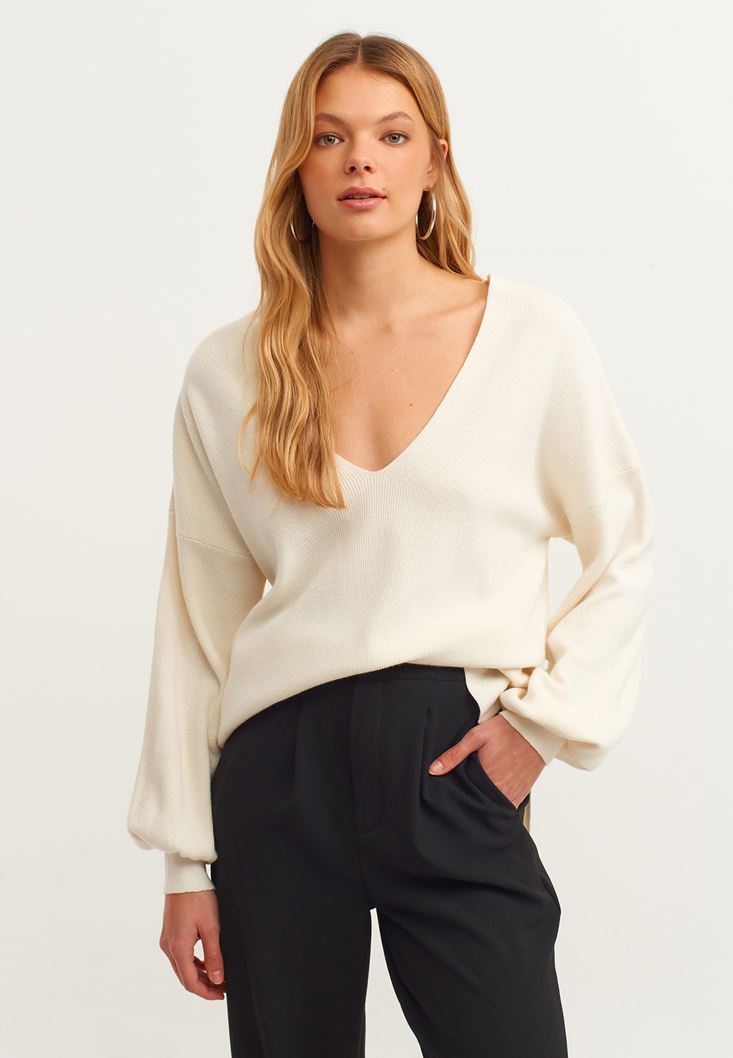 Krem Balon Kollu Triko Kazak