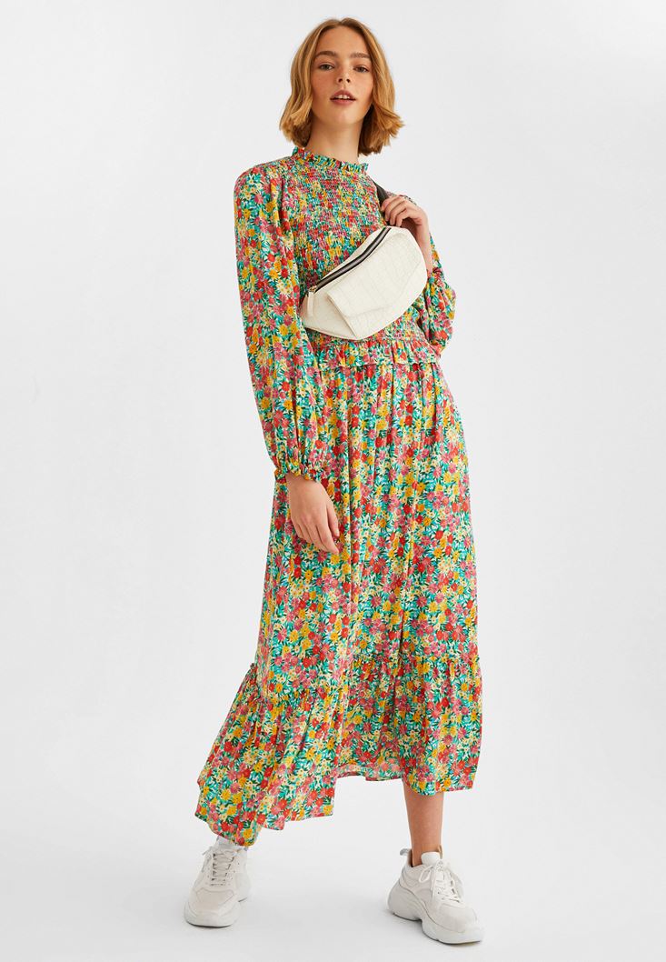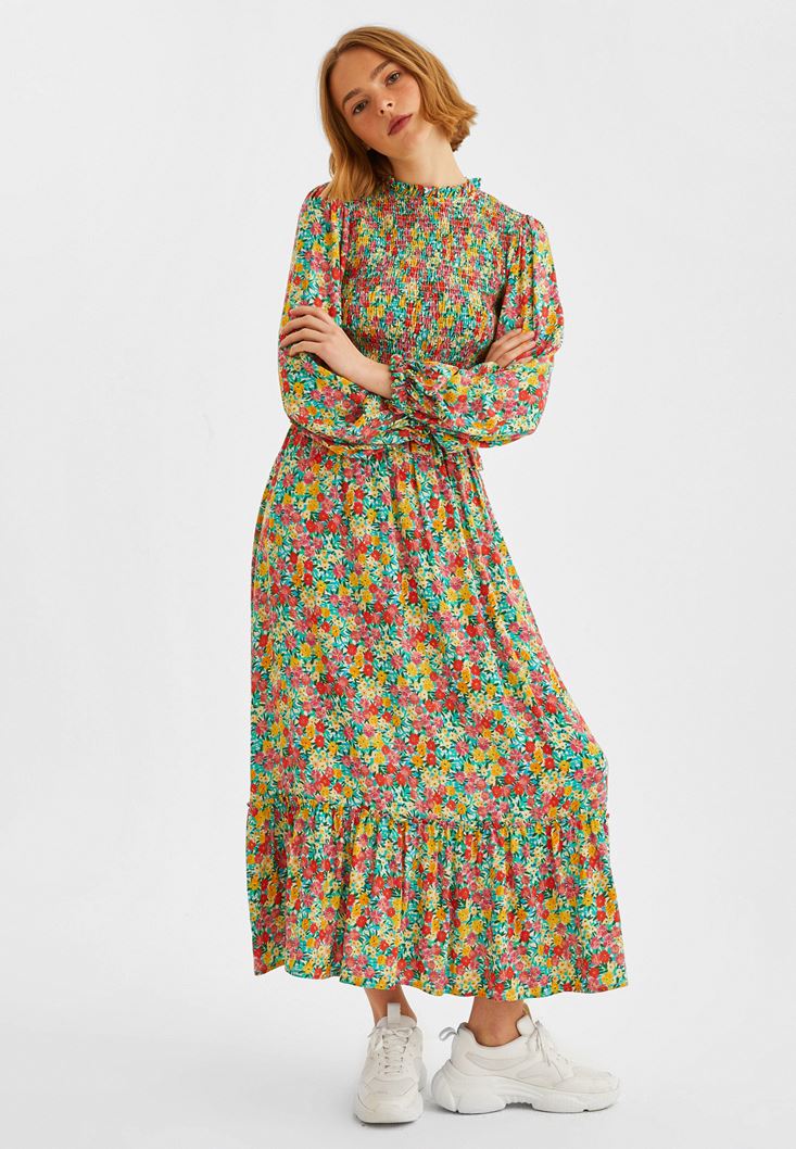 Balon Kollu Uzun Elbise modeli, viskon içerikli mükemmel dokusu ve hoş çiçek desenleri ile Oxxo'da sizlere sunuluyor. Uzun elbise modeli, büzgülü kumaş yapısı ve fırfır detayları ile yeni sezonda ön plana çıkıyor. Balon kollu desenli elbise modeli, günlük kombinlerinizi en iyi şekilde tamamlamanız için ideal bir seçenek oluyor. Zariflik elde edeceğiniz uzun elbise modeli ile topuklu botları veya ayakkabıları bir araya getirebilirsiniz. Askılı çantalarla taçlandıracağınız kombinlerinizi desenli elbise modeli sayesinde fazlasıyla vurgulayabilirsiniz. Oxxo'nun hoş dokularla ve dikkat çeken desenlerle sizlere sunduğu uzun elbise modelleri ile siz de tarzınızı dilediğiniz gibi şekillendirebilirsiniz.