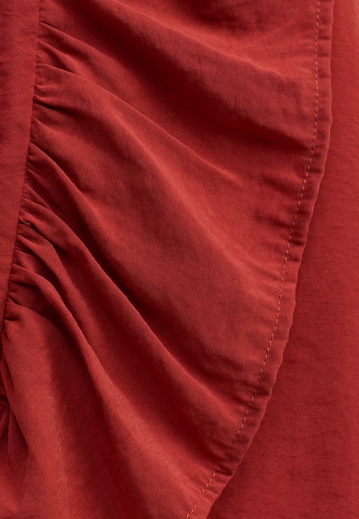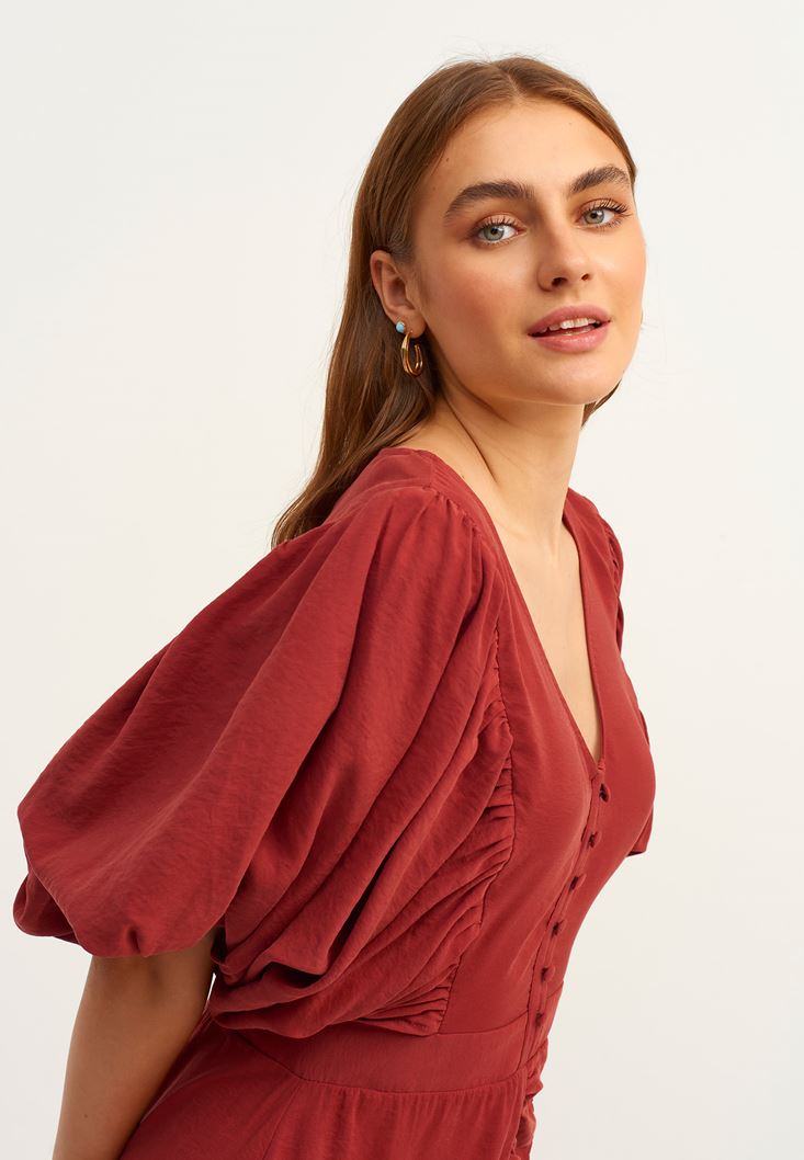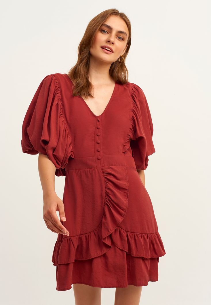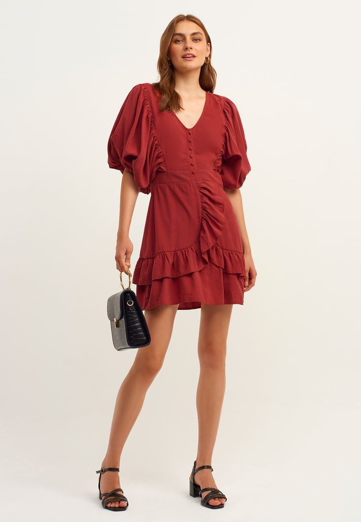 Modal karışımlı özel doku, derin V yaka, hacimli balon kollu, ön kısmı düğme detaylı, katlı ve fırfırlı etek, ön kısmı kruvaze fırfırlı, mini boy.