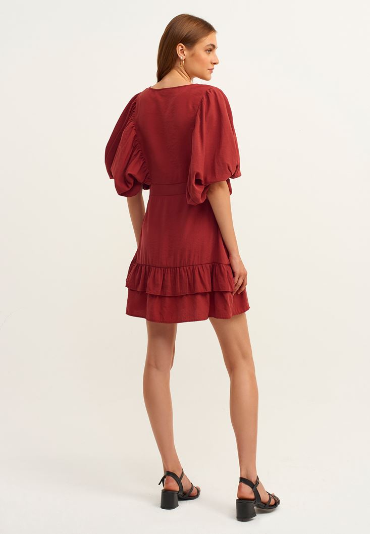 Bordo Balon Kollu ve Fırfır Detaylı Mini Elbise ( MODAL )