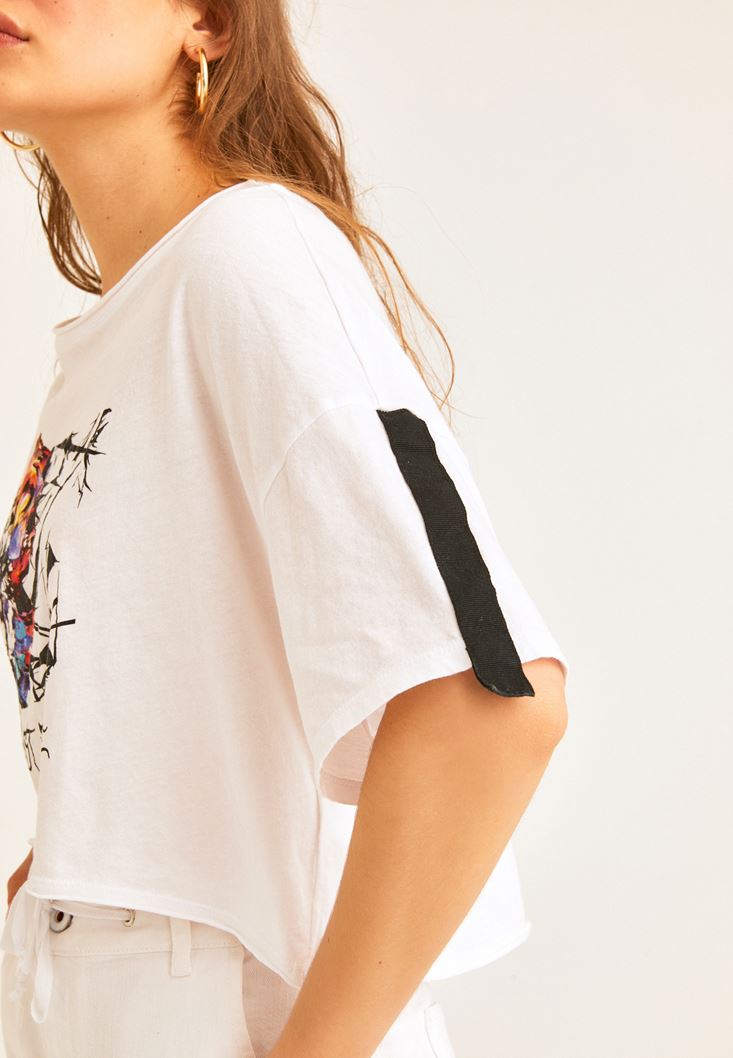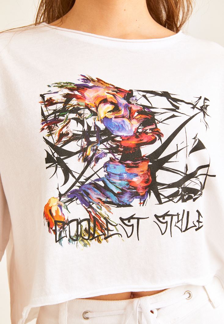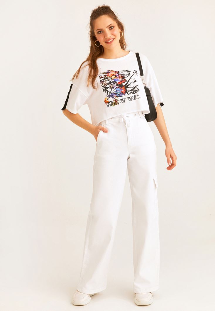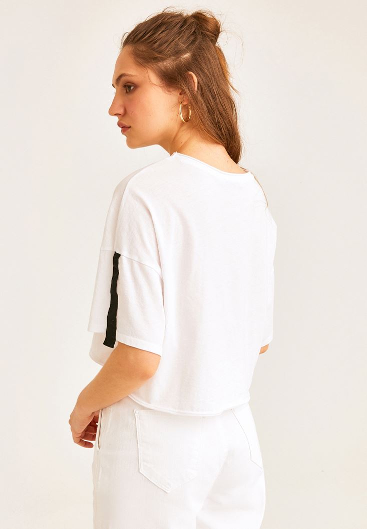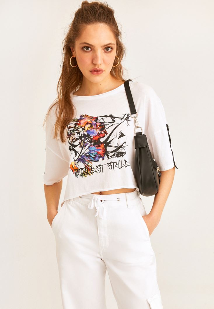 • Bayan Beyaz Baskı Detaylı Crop Tişört