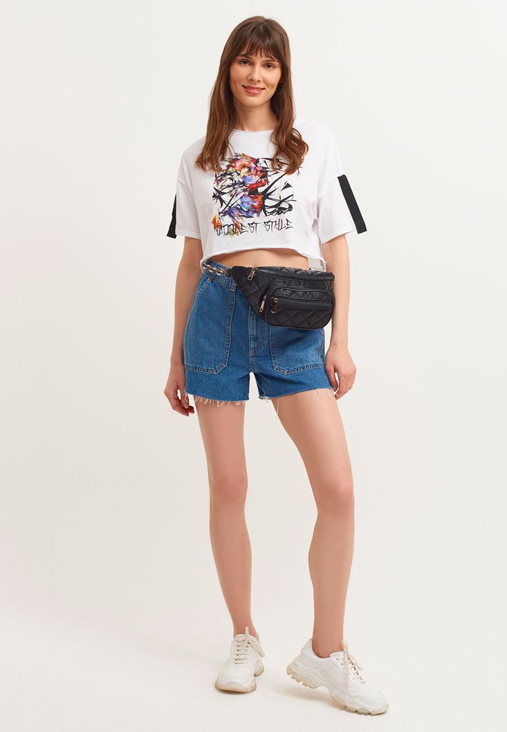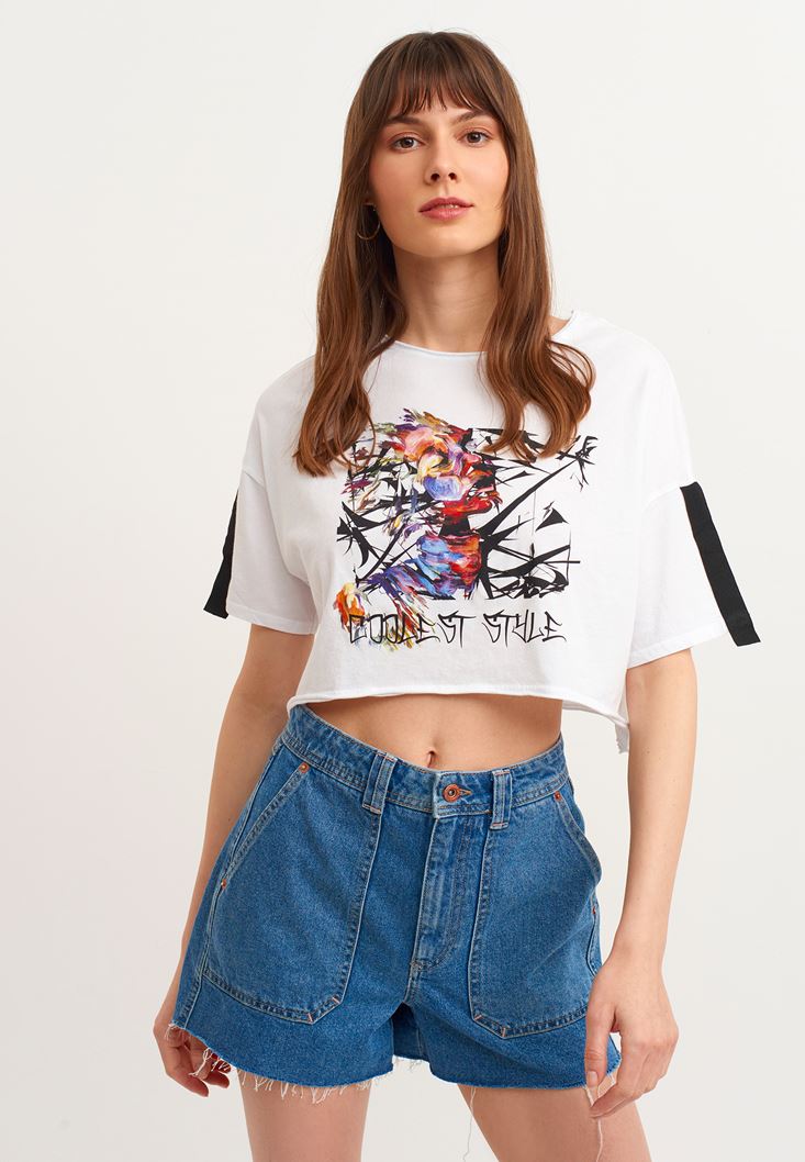 • Bayan Beyaz Baskı ve Şerit Detaylı Pamuklu Crop Tişört
