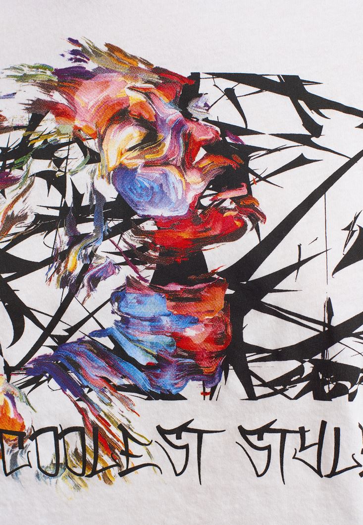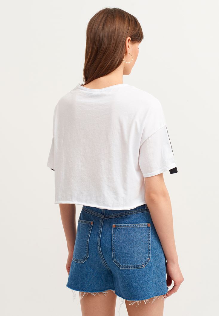 Beyaz Baskı ve Şerit Detaylı Pamuklu Crop Tişört