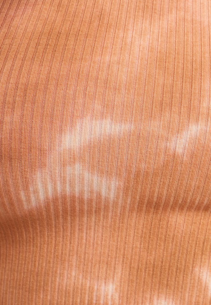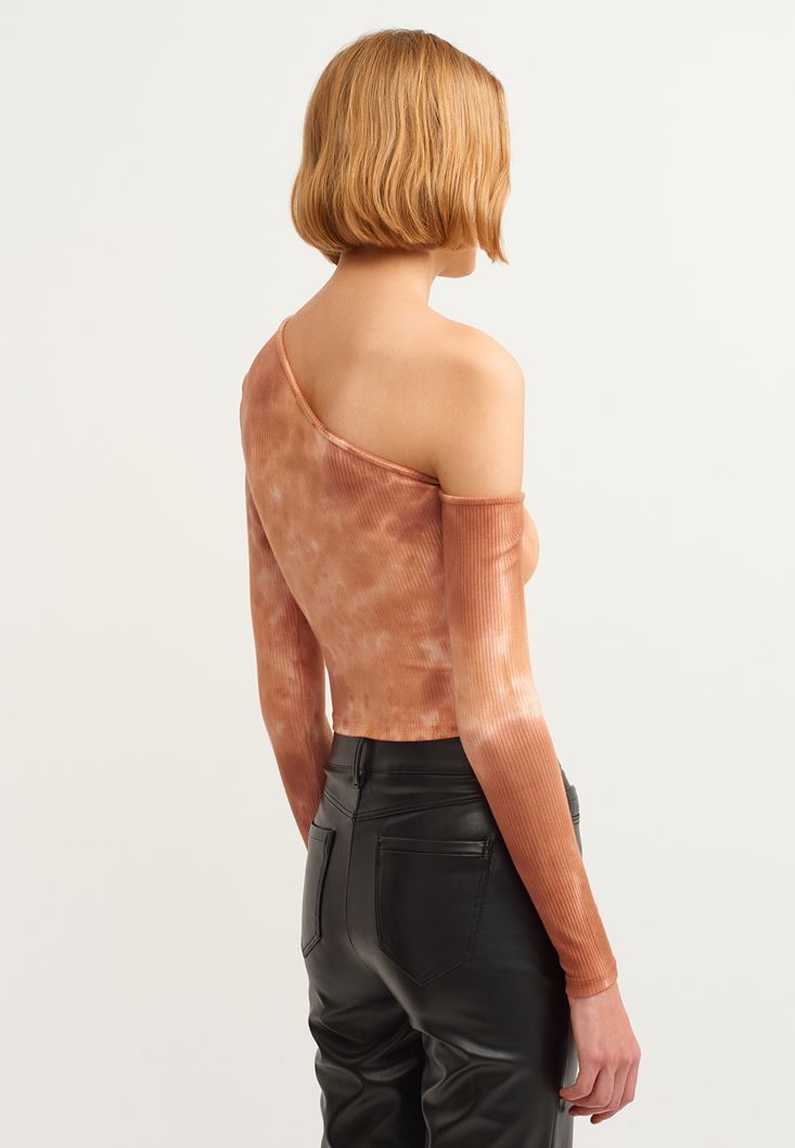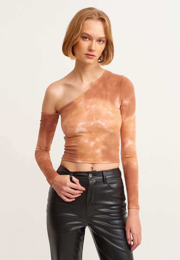 Viskon karışımlı fitilli doku, bedeni saran esnek fit, asimetrik yaka, crop kesim, uzun kollu, batik desenli.