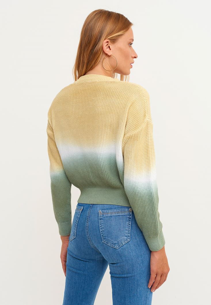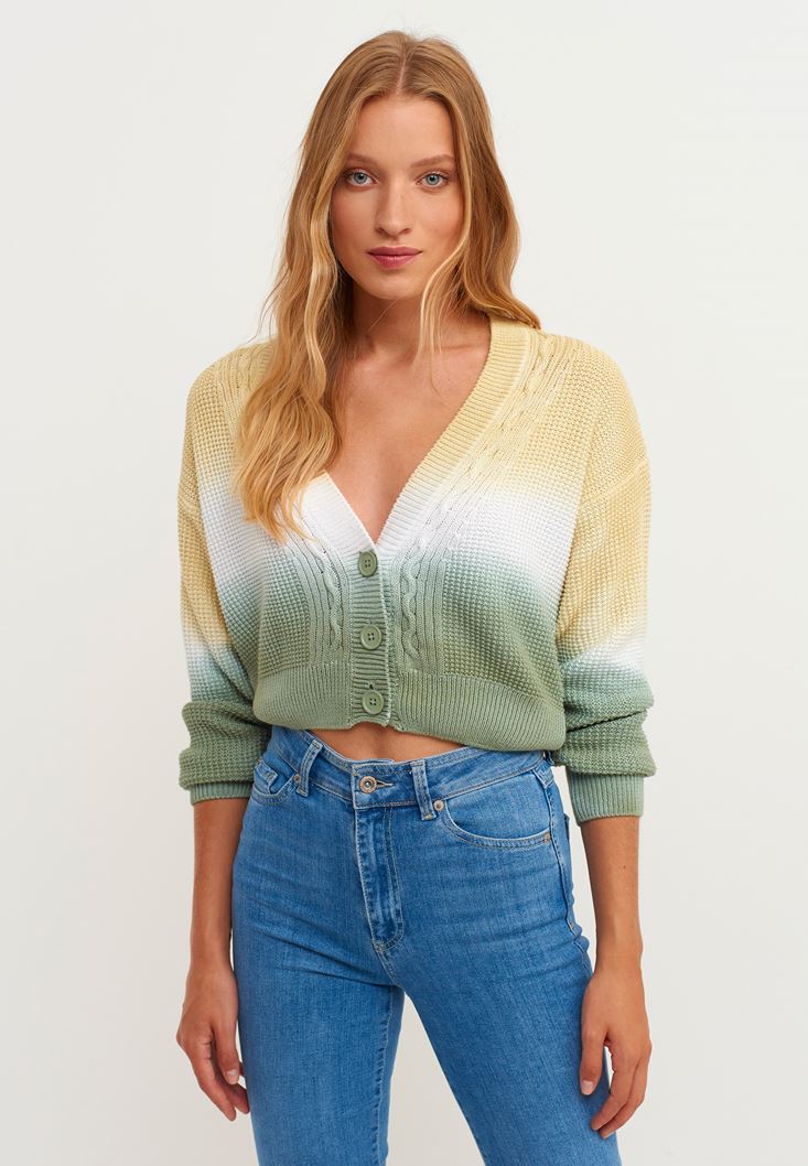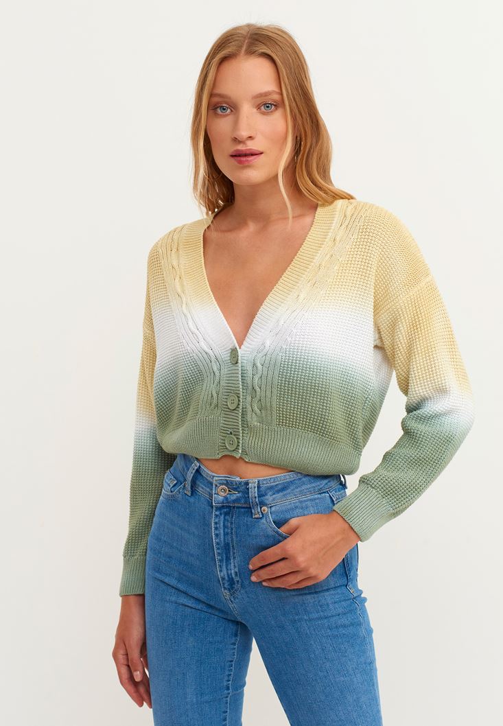 %100 pamuklu triko, crop kesim, batik desenli, ön kısmı düğme kapamalı, uzun kollu, dokulu örgü tasarımlı.