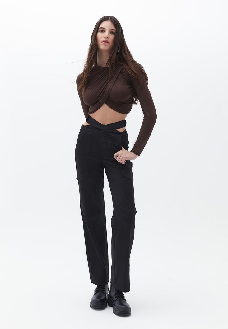 Pamuk karışımlı doku, ultra yüksek bel, bol paça, kargo cepli, beli cut out detaylı, bedenden uzak baggy fit, bel detayı çıtçıtlı.