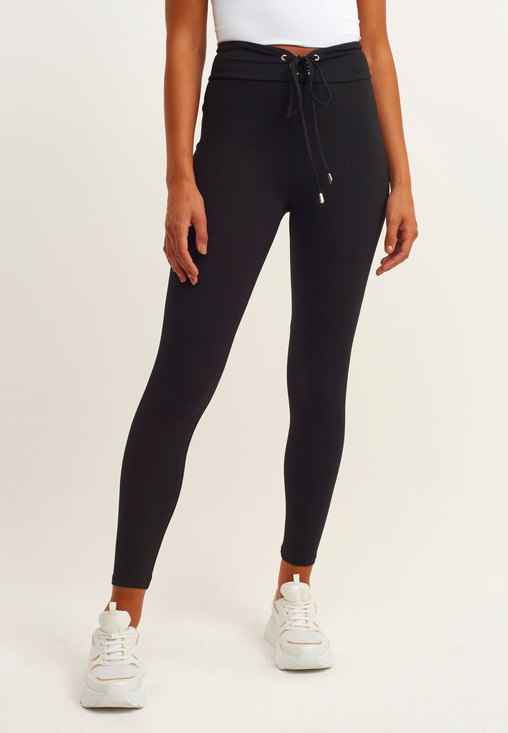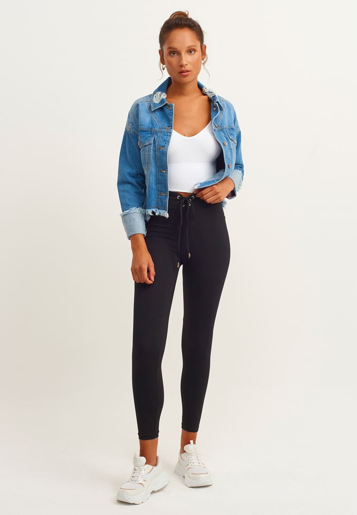 Pamuk karışımlı doku, beli bağcık detaylı, bedeni saran esnek kalıp, yüksek bel, bilekte biten paça boyu.