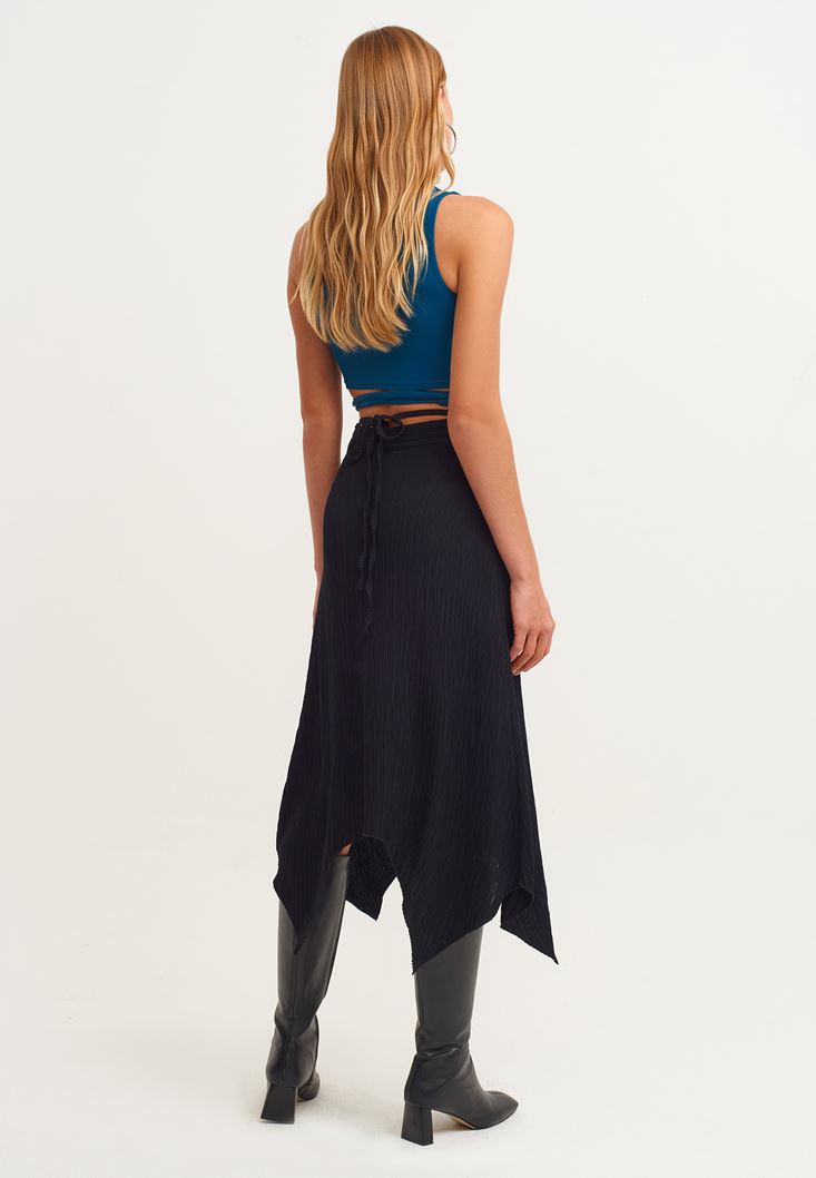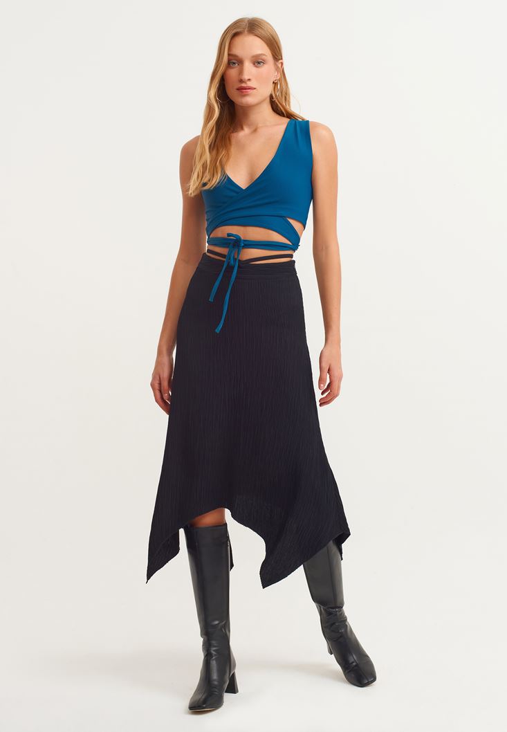 Viskon karışımlı özel doku, ultra yüksek bel, asimetrik kesim, beli bağcık detaylı, midi boy, A line kesim.