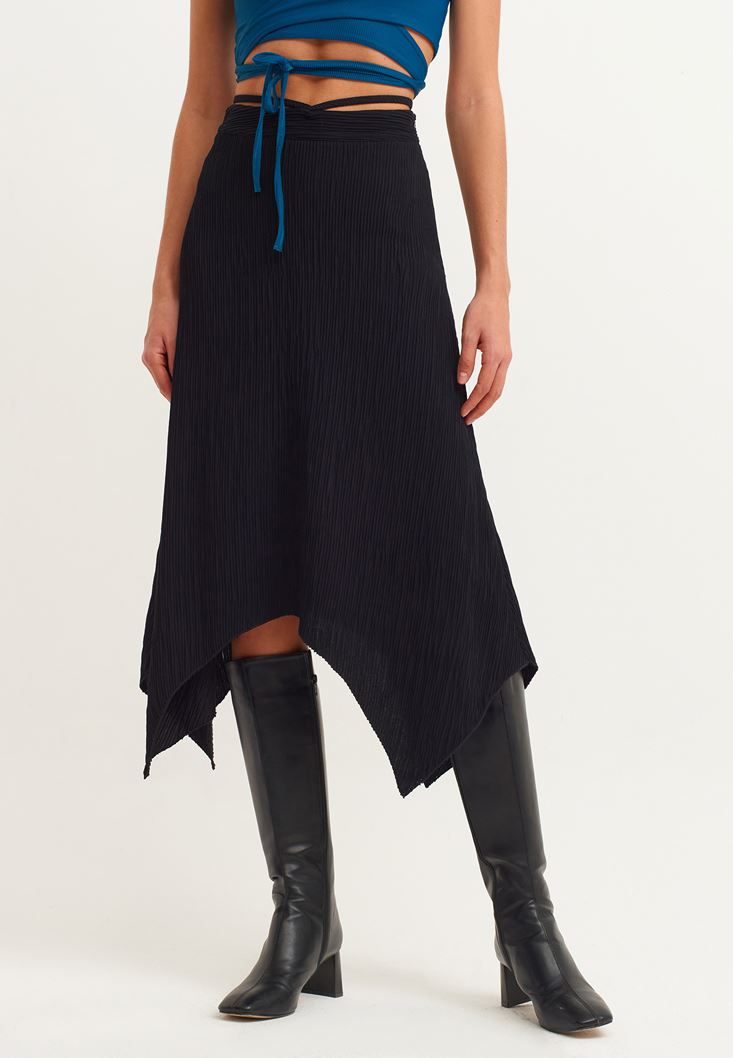 • Bayan Siyah Bel Detaylı Piliseli Midi Etek