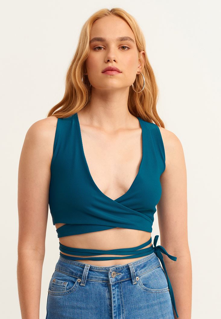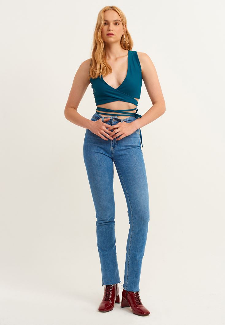 • Bayan Mavi Belden Bağlamalı V Yaka Crop Top