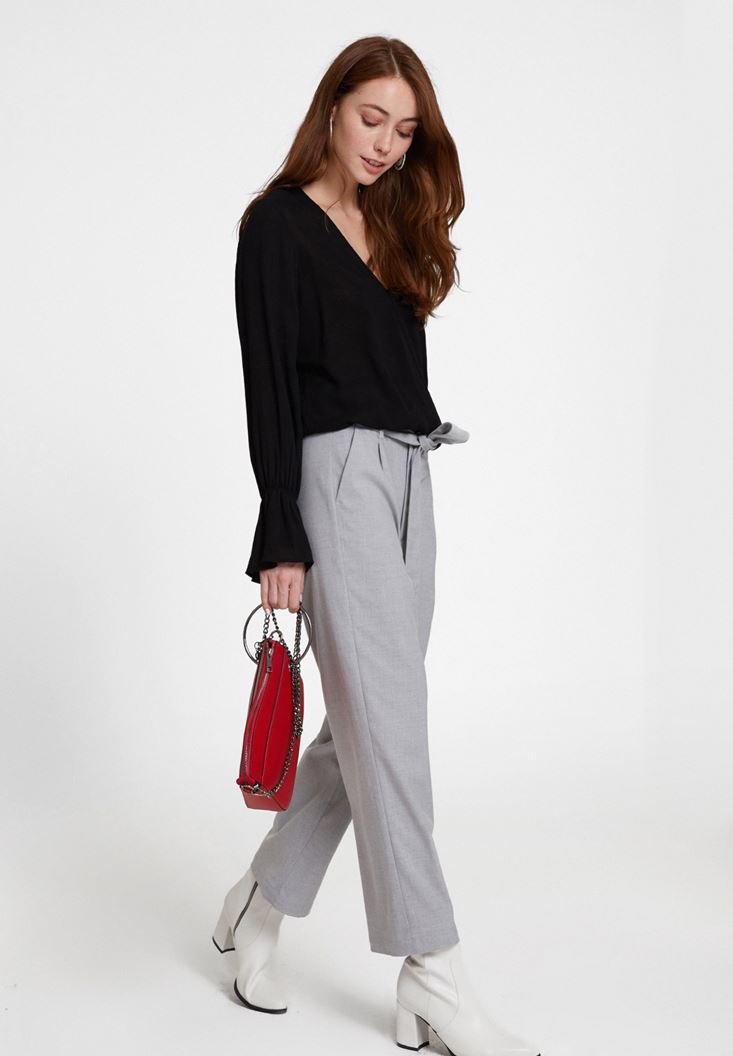 • Bayan Gri Beli Bağlamalı Cep Detaylı Bol Pantolon