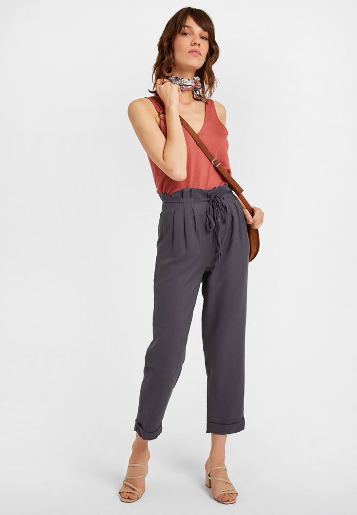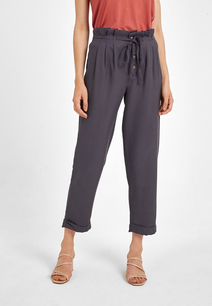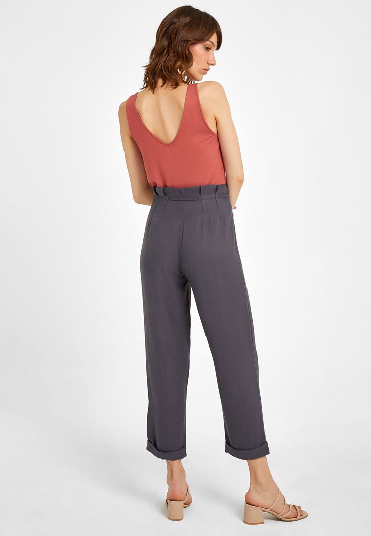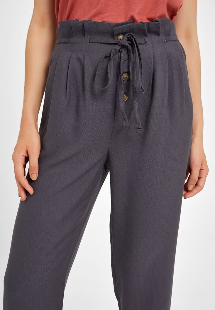 Gri Beli Bağlamalı Düğme Detaylı Pantolon